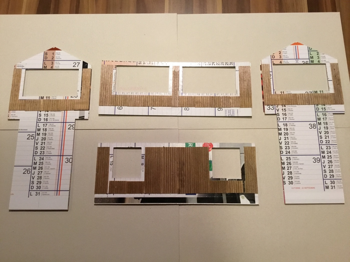 L'intérieur du poste est un sol en parquet et les murs sont recouverts de lambris. Toutes ces boiseries seront réalisées par des lattes de peuplier de recup'. Je trempe les couvercles dans l'eau pour les aplanir, on laisse sécher puis une couche de teinture au broux de noix. Une fois séchées les lattes sont tracées au critérium. Il ne reste plus qu'à contrecoller sur les éléments de calendrier.