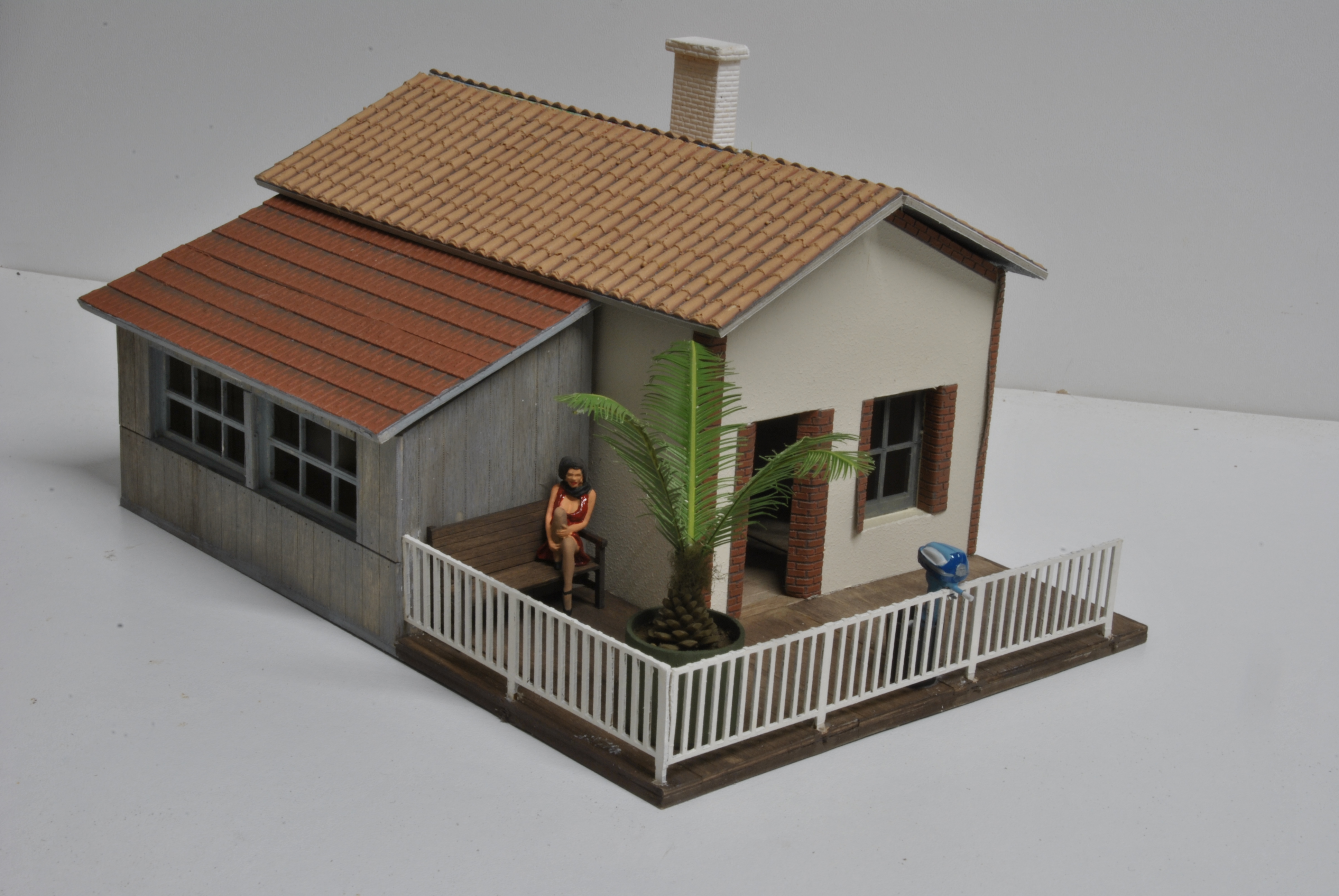 C'est un peu plus présentable, la terrasse à reçu quelques accessoires, j'en ajouterai d'autres avant de tout coller sur le réseau, le bâtiment est juste posé sur le socle. Les fenêtres sont posées, encore 2 portes à fabriquer.