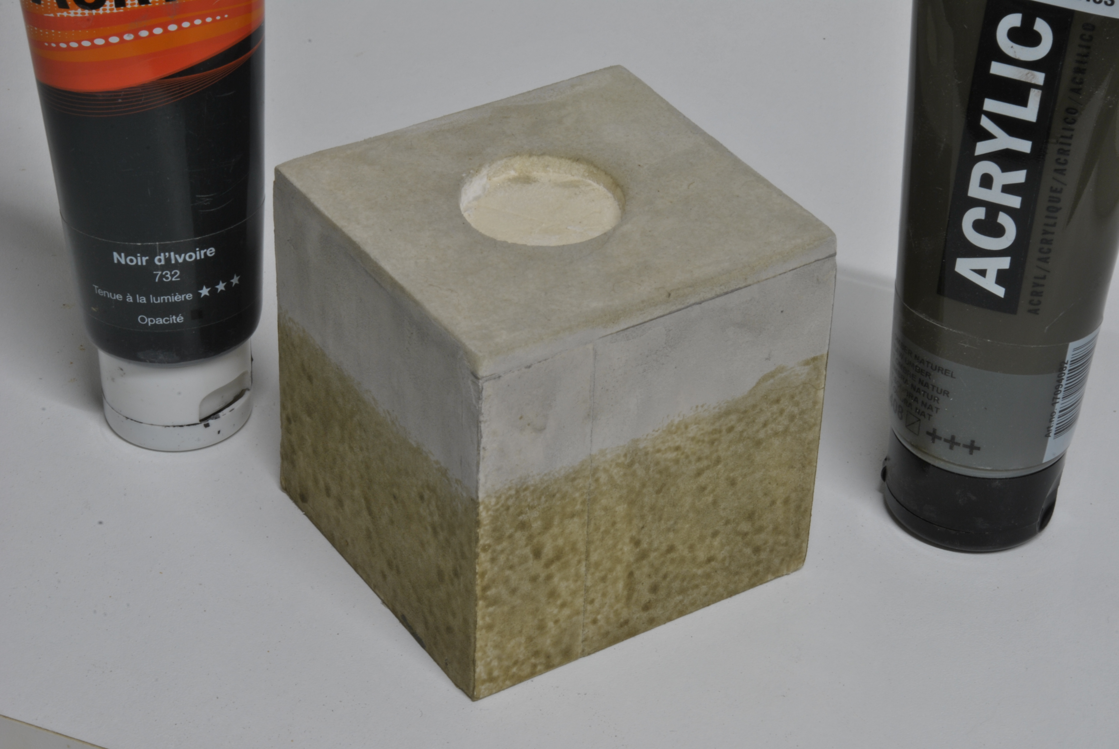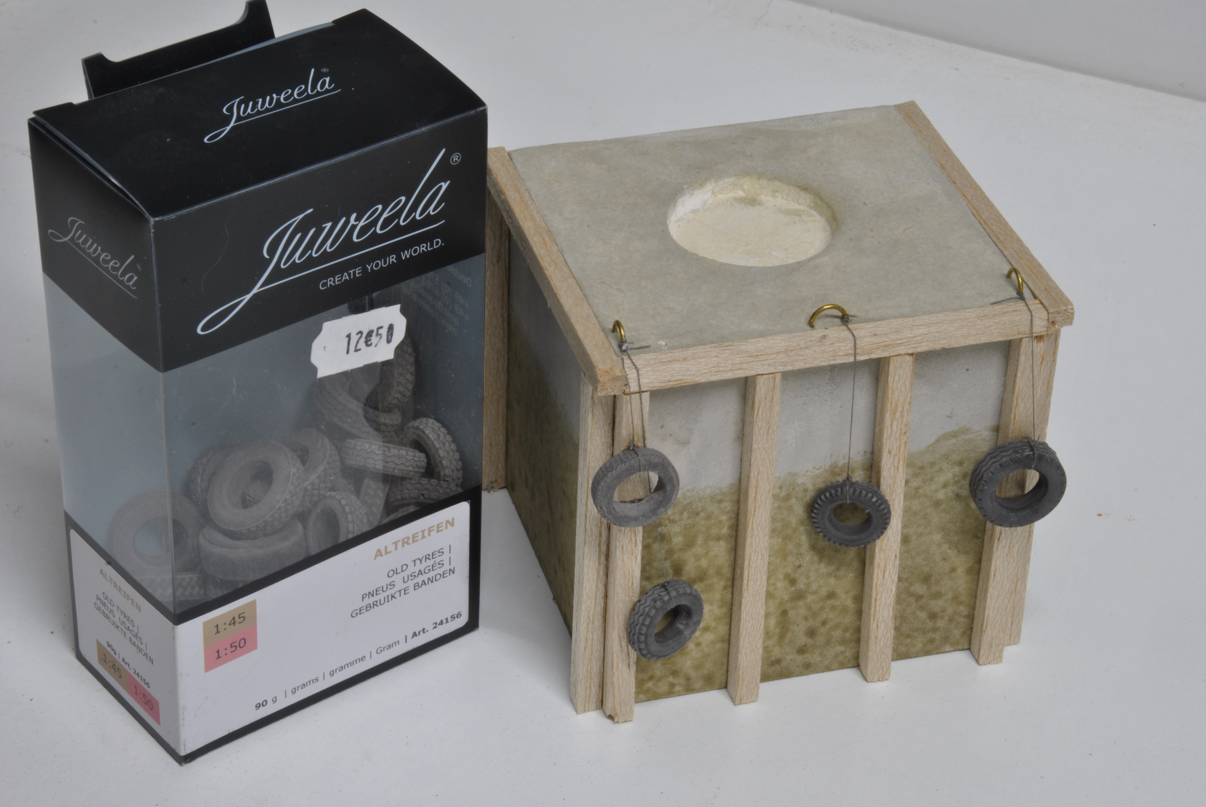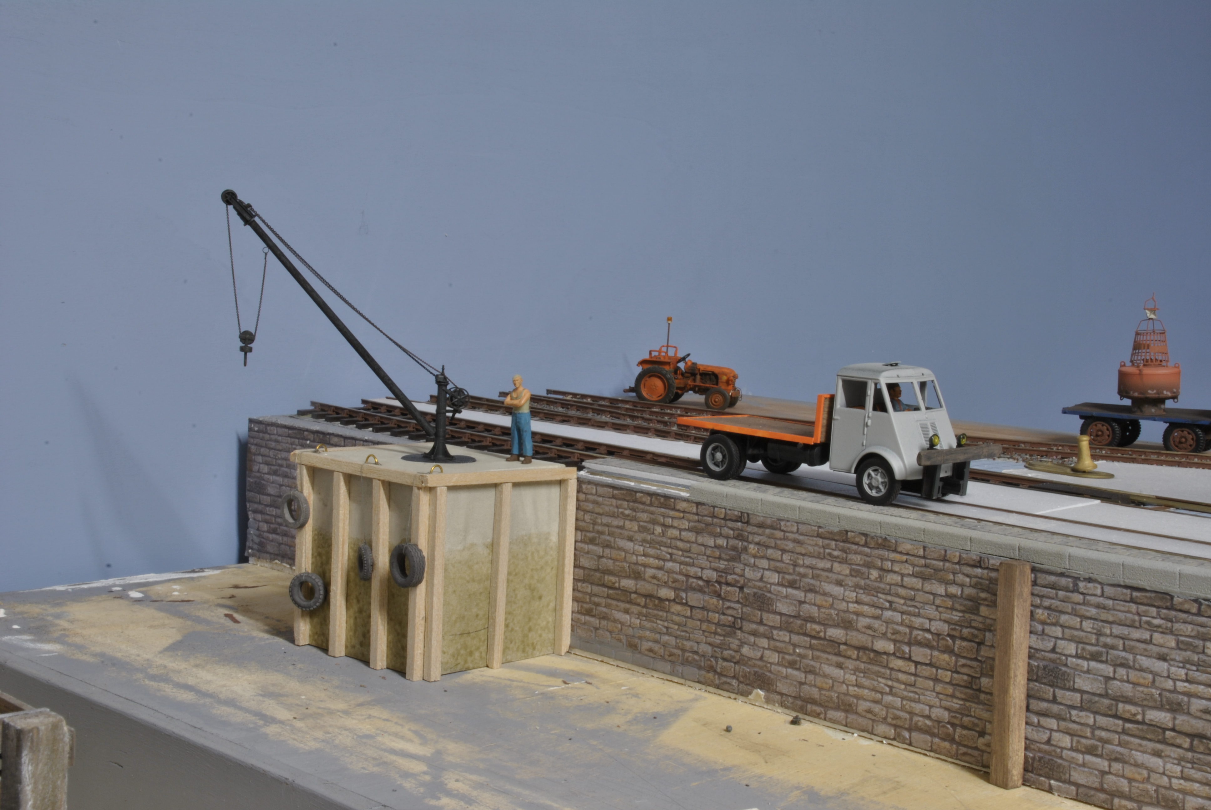 Après avoir préparé un caisson en carton plume, je l'ai enduit. Après ponçage, je fais des lavis de noir sur le dessus, puis une passe au rouleau en mousse sur la partie sous-marine. Juste une teinte de base. Les accessoires sont ajoutés, j'ai pris exemple sur le site réel. Premiers essais de pose, à valider après peinture et patine définitive de l'ensemble Petit rappel