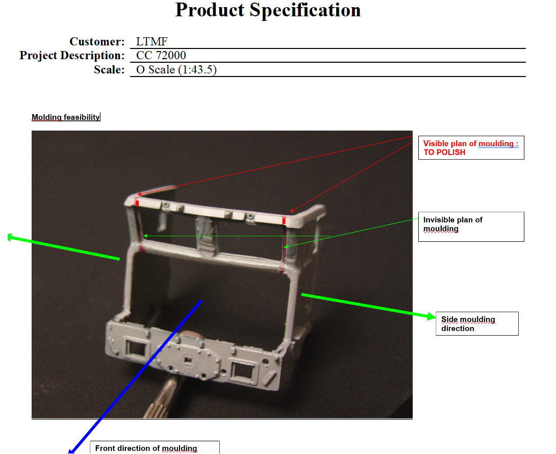 On donne aussi des indications, comme par exemple où mettre les plans de joint des moules (bon le bureau d'étude de l'atelier est suffisamment compétent pour le faire tout seul mais ça ne coûte pas plus cher de conseiller) :