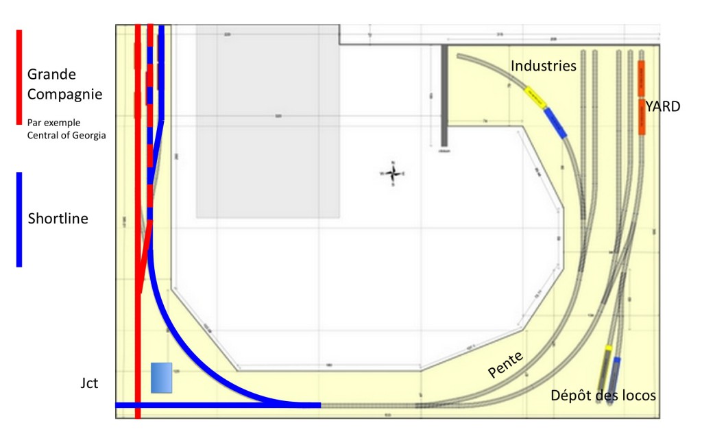 J'ai vu que tu as une big loco C of G (Central of Georgia). Elle pourrait très bien circuler sur la ligne principale (voie en rouge sur le plan).