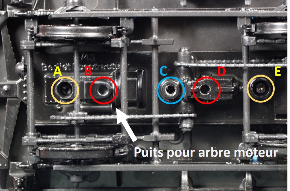 A et E pour les vis qui maintiennent chassis, plateau et cabine