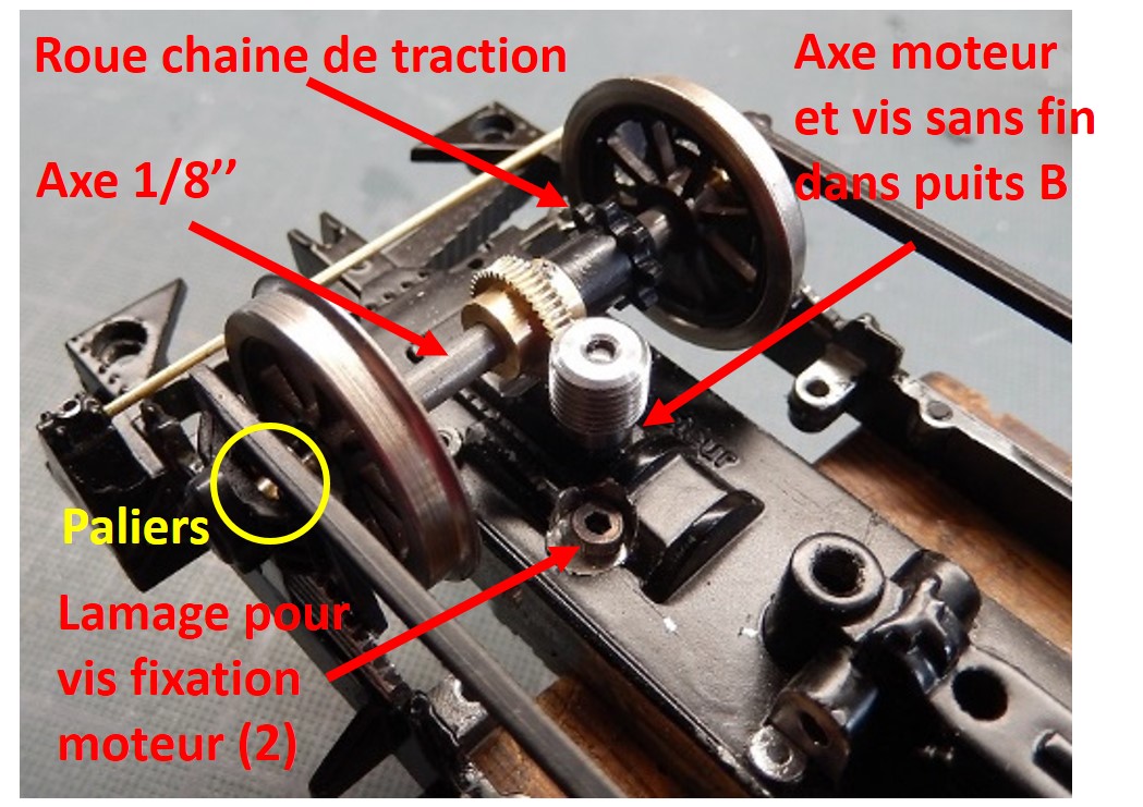La motorisation proposée et la réduction roue dentée / vis sans fin choisie font que l'axe moteur passe...exactement dans le puit B, qu'il suffit de faire déboucher par perçage (2,5 ou 3 mm pour axe de 2)