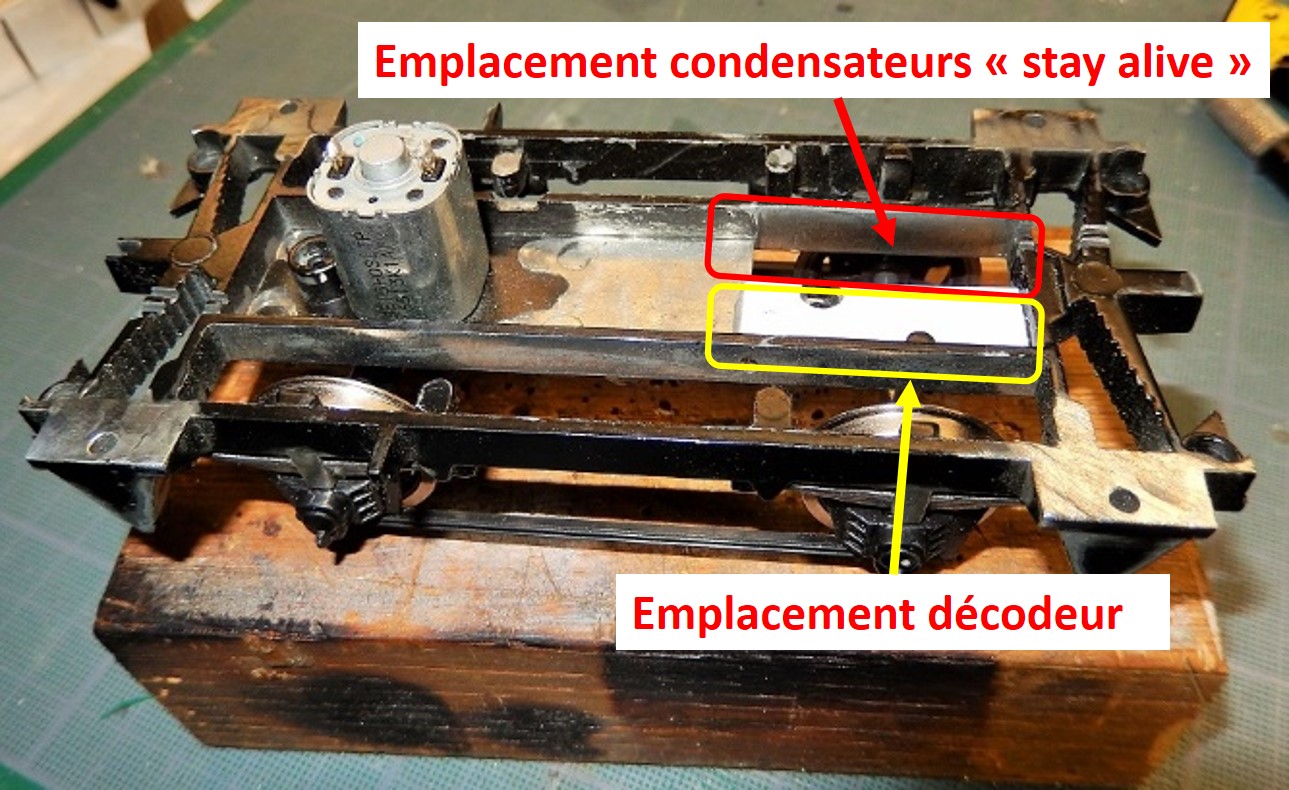 On voit les lames de contact electriques (1 de chaque coté) reliées au décodeur La taille carrée du moteur convient exactement à l'emplacement sous le capot, en arrière du puit de vis