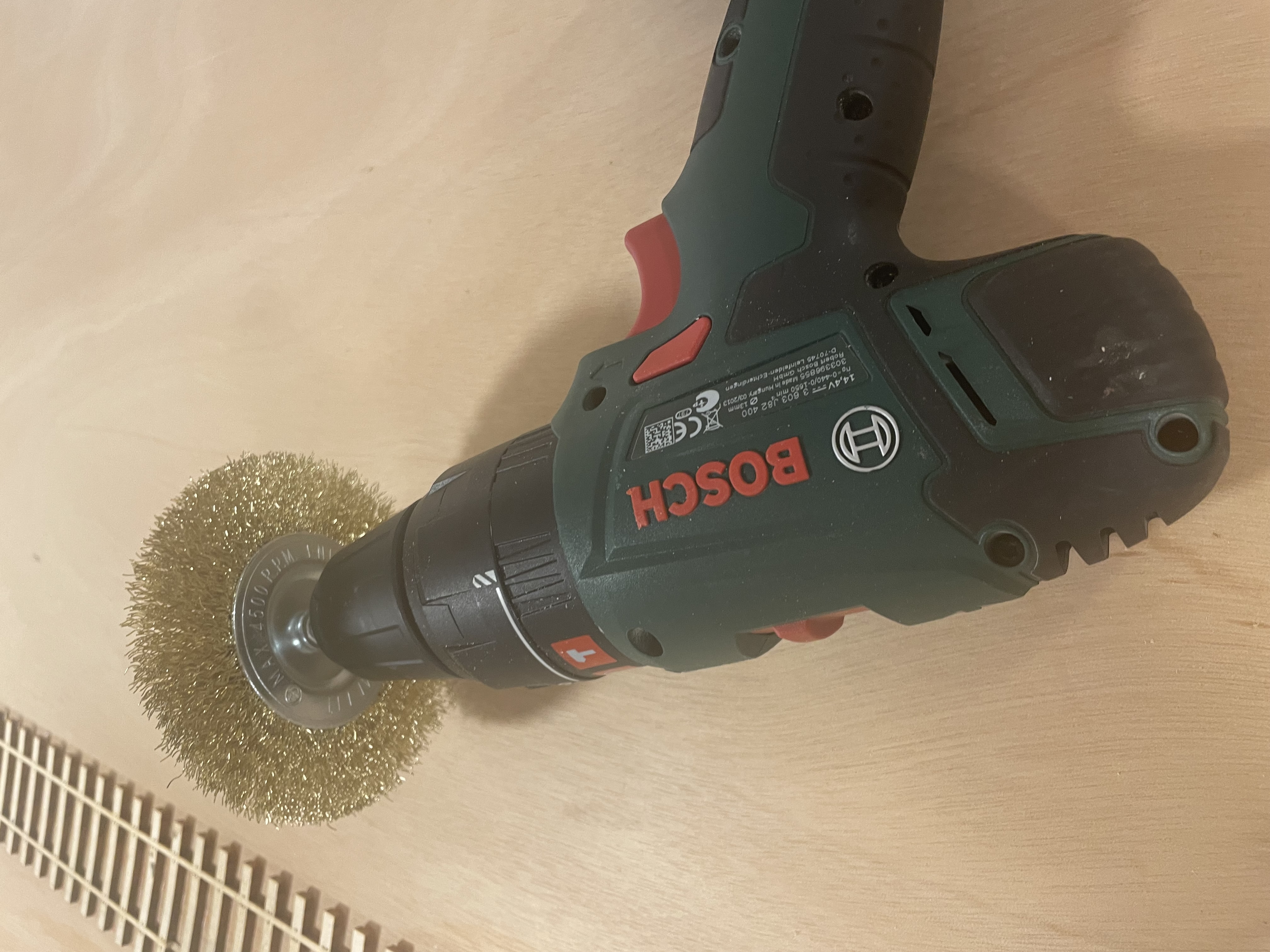 Vieillissement à la perceuse visseuse équipée d'une brosse métallique. Premier essai en position perçage, trop rapide arrachements et casse.