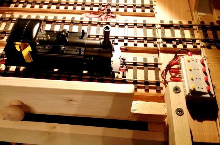 Le tiroir est plus facile à manipuler avec le poids des 4 locos, et l'ajustement de la voie du tiroir avec celle du module est vraiment facile : ça se fait à l'œil, et le tiroir ne bronche pas quand la loco passe et repasse sur la jonction !