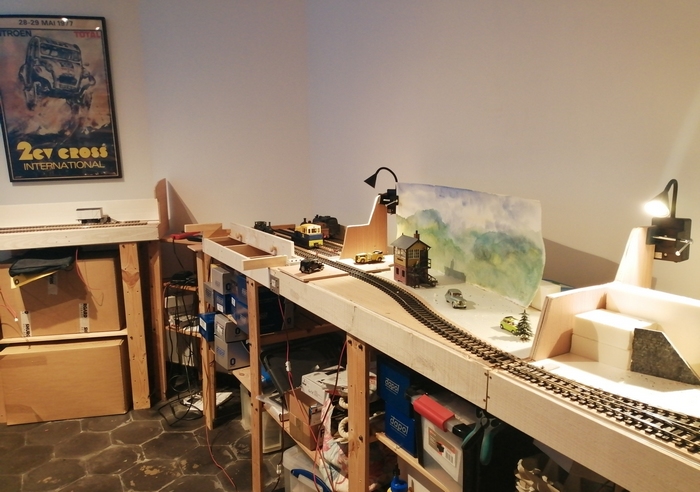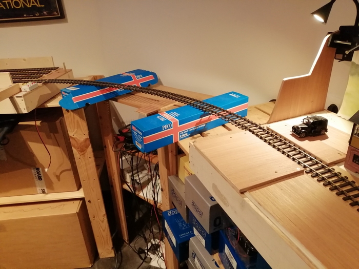 La suite : le mur sur lequel se situe le réseau a un angle ! je sais caser 3 modules, mais le 4ème ( la coulisse ) ne sera pas dans l'alignement ! il faut donc un petit module intermédiaire pour joindre la coulisse au 3 autres modules ! actuellement, il n'y a que 2 modules raccordés à la coulisse, le 3ème étant en attente sur la partie réservée à la coulisse ... si je me fais bien comprendre .. :siffle: