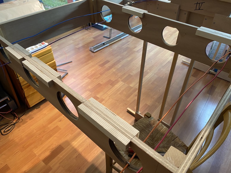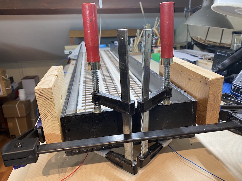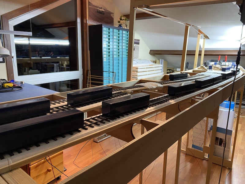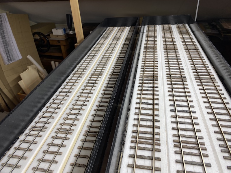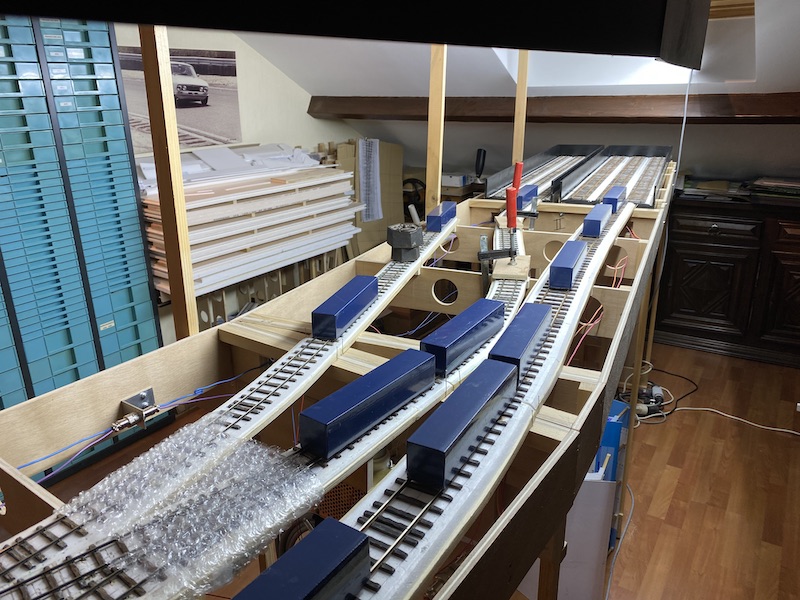 Collage des supports de voie sur les différents modules (à l’exception de la voie Om comportant des embranchements, qui restent à terminer de construire).