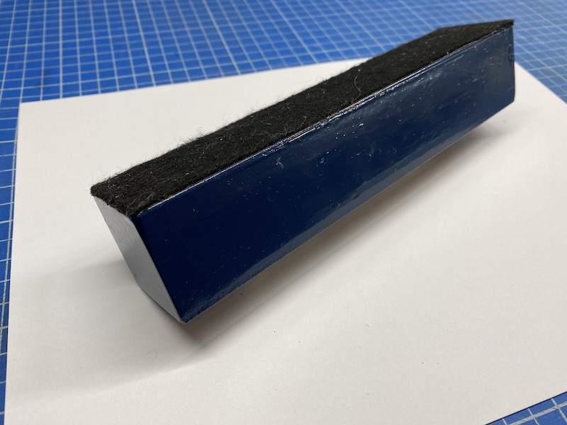 Après avoir passé une couche d’antirouille, j’ai peint la barre en bleu (2 couches), et j’ai garni la partie inférieure d’un feutre autocollant de protection.