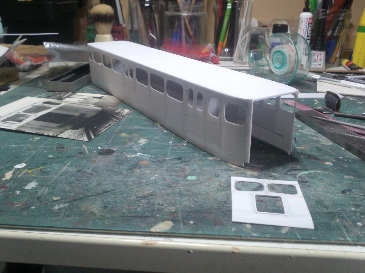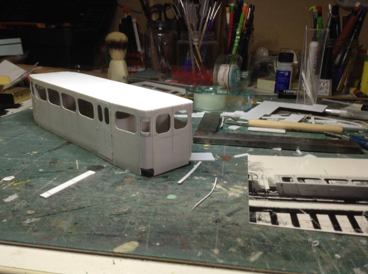 Je me suis réfugié dans la fraîcheur relative de mon atelier pour continuer ces caisses. A ce sujet, je remercie messieurs Million et Guiet, les carrossiers du M 41 ( dont les ateliers de Lumbres se sont inspirés pour construire la nouvelle carrosserie de l'ex ARb 2 du reseau du Pas de Calais, qui devint le M 31 du CFBS) pour leurs arrondis de baies qui m'ont procuré de longs moments de travail à la lime....mais quand on aime.... À suivre!