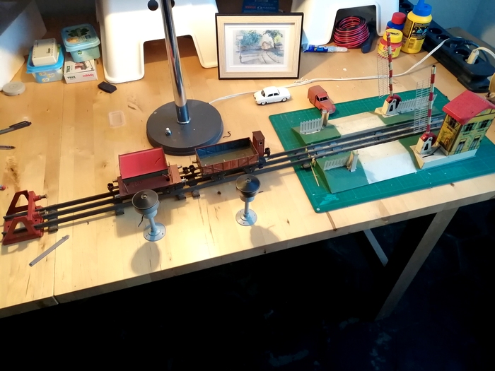 Et pendant ce temps, Raphael, qui est à la maison tout les mercredis après midi, veut jouer avec le train !! Bon, c'est un peu le foutoir sur les rails, et je suis désolé, mais le train ne peut pas rouler ... J'ai mon vieux passage à niveau, il me le montre, "Avec celui là, je peux jouer ?? "