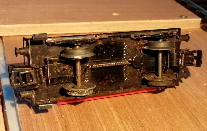 Problème, il est en 3 rails, et vu le châssis en métal, il sera difficile de le passer en 2 R ... je vais donc chercher des wagonnets Fleischmann, assez faciles à trouver, et bon marché pour ceux que j'ai vu sur eBay !
