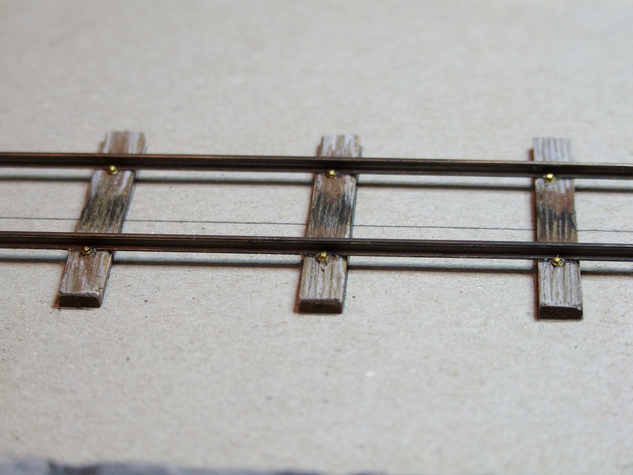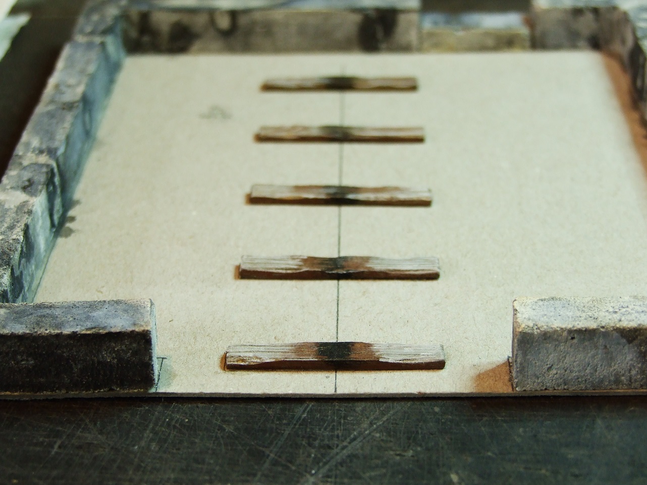 Une fois que toutes les traverses ont été peintes à l'aquarelle en tube, puis ont reçu leurs patines, je les colle bien dans l'axe avec