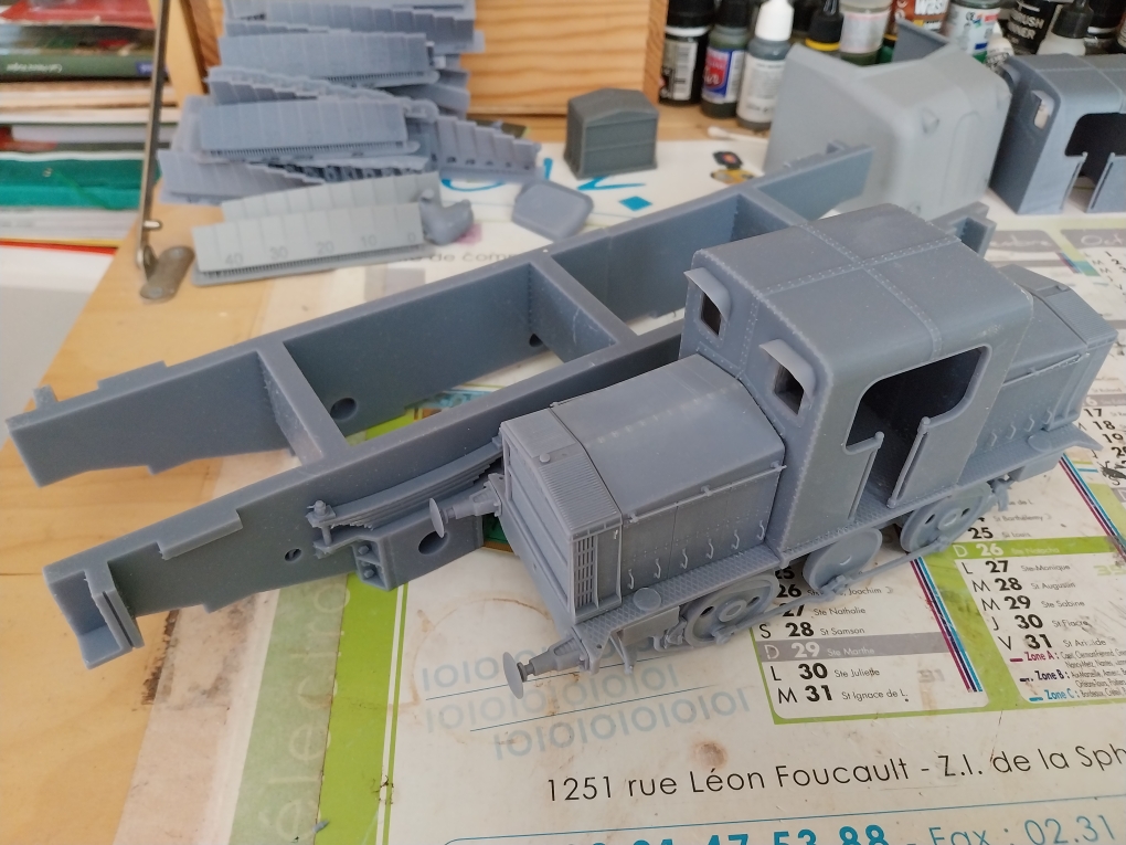 Je joins quelques photos. Je vais aussi essayer le 1/16ième car en modèle de vitrine, çà peut peut-être être sympa. Voici en arrière plan le châssis qui est imposant.