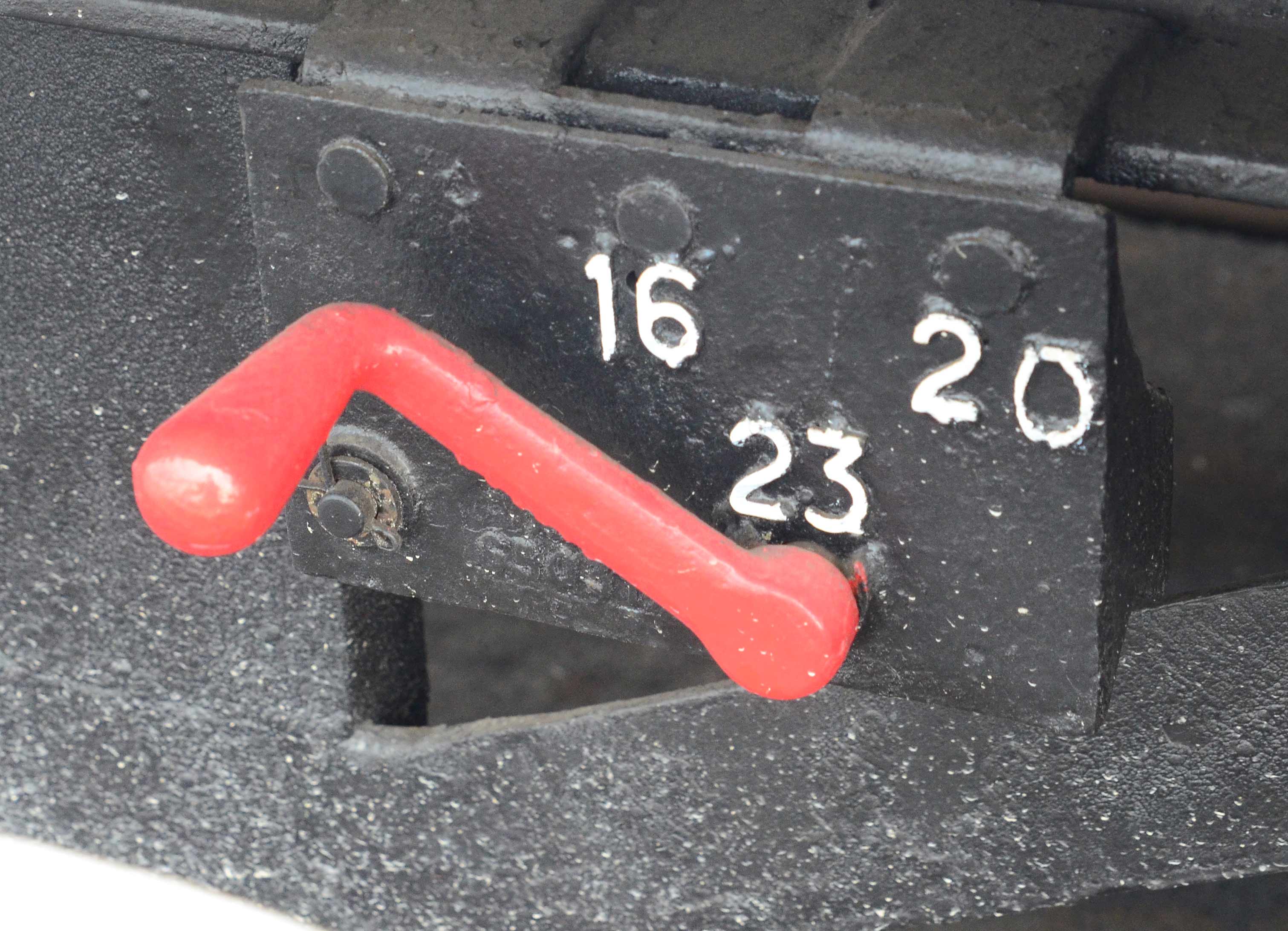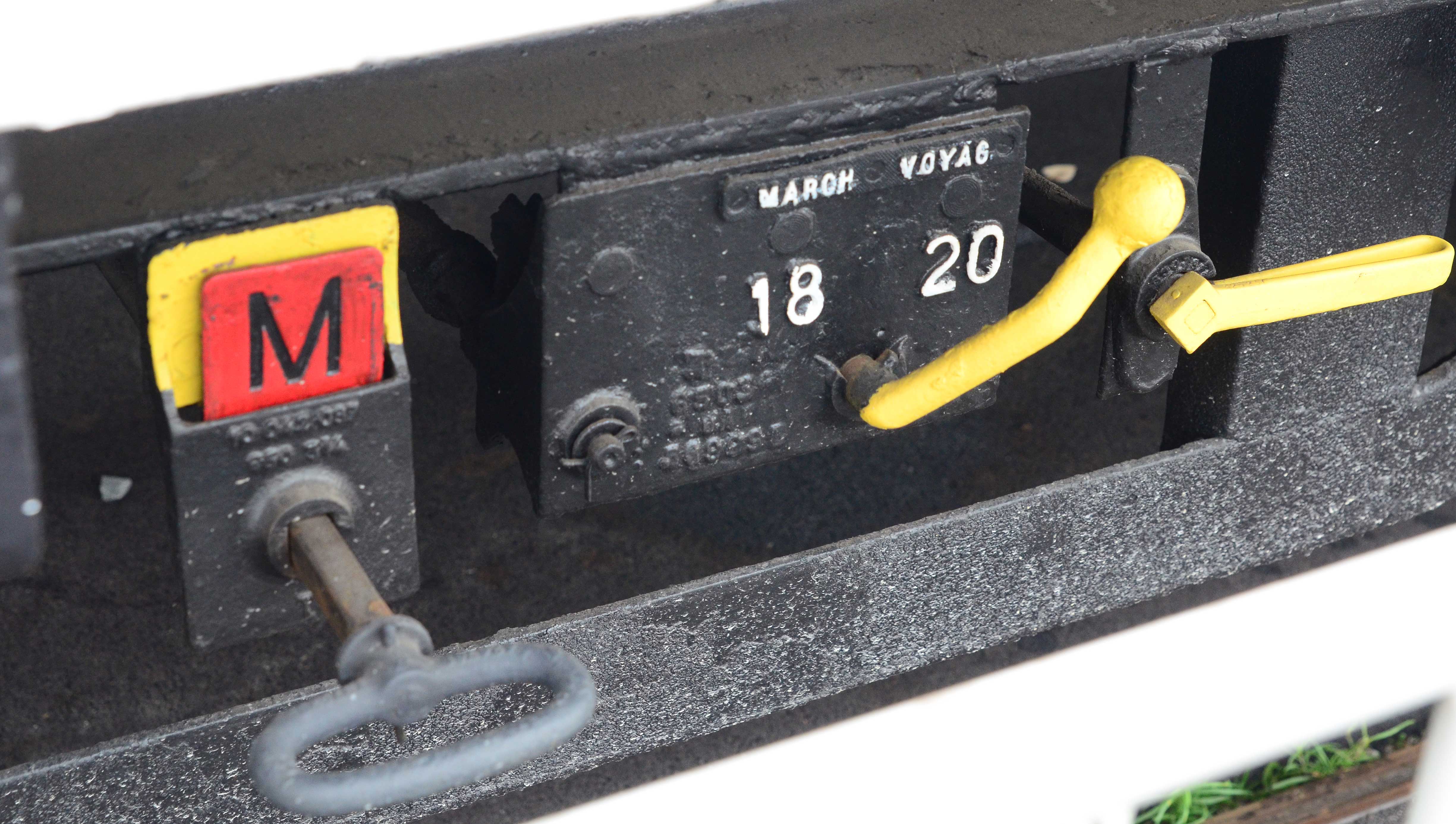 Sur la troisième, on a de gauche à droite la valve de purge, la commande plaine - montagne, la commande voyageurs - marchandises et la manivelle vide - chargé.