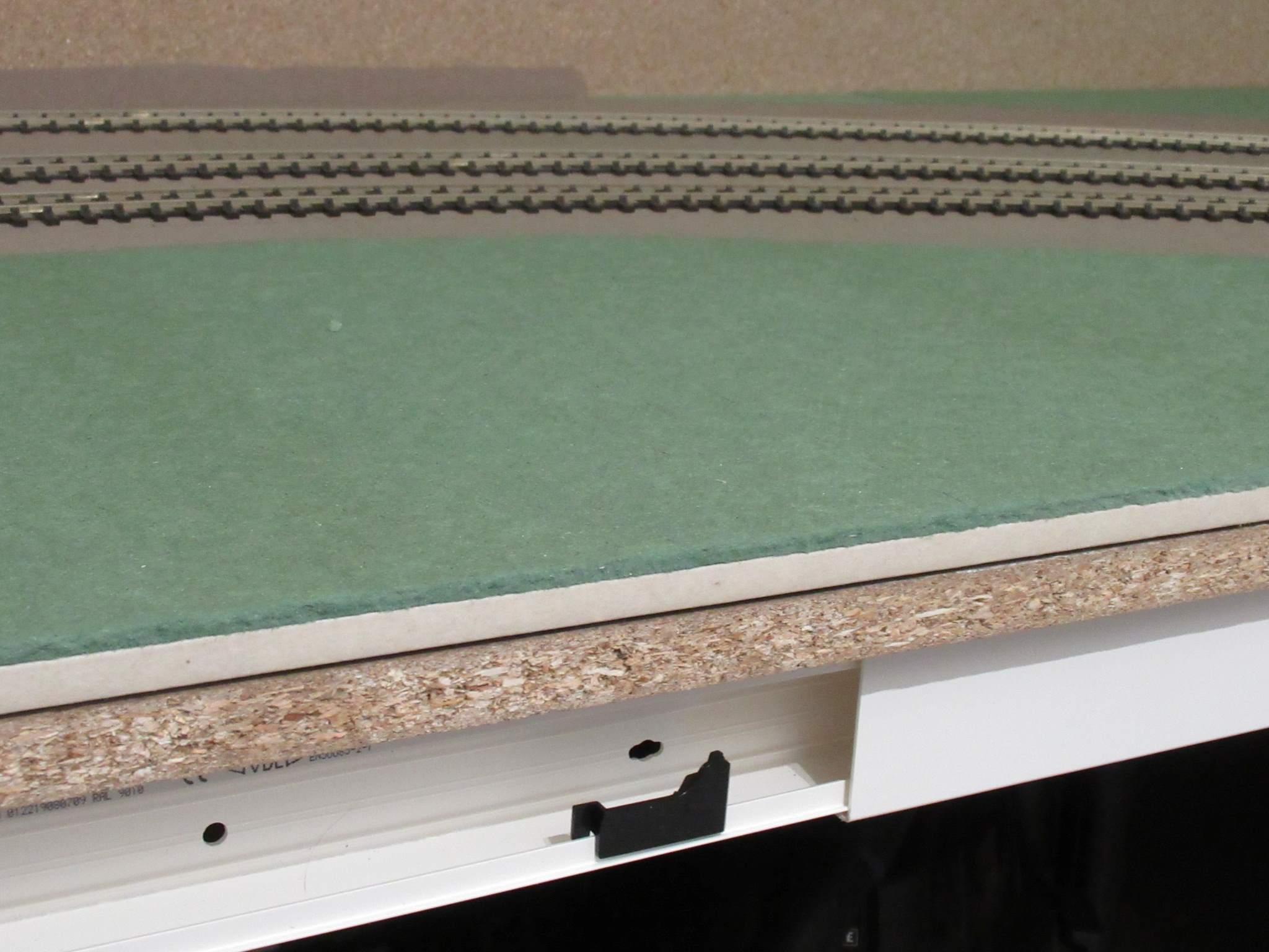 Afin de faciliter le transport des fils électriques vers le poste de commande, j’ai placé en périphérie de l’intérieur du réseau sous le plateau, des goulottes (60 x 40 mm). Elles serviront d’une part à acheminer les câbles, mais aussi permettront tous les raccords électriques par dominos ou soudures. Plus besoin de se casser le dos pour faire les connections sous le plateau.