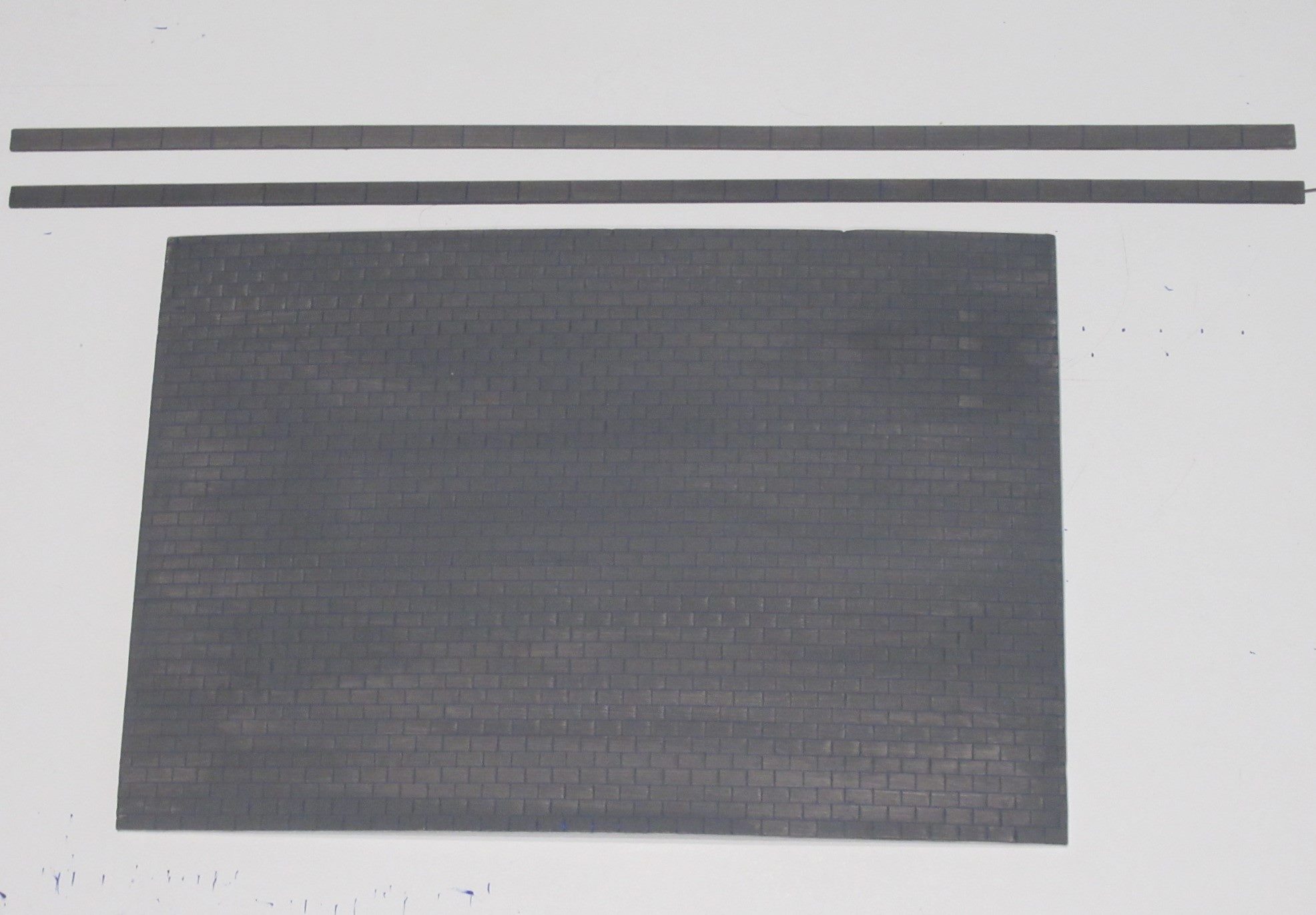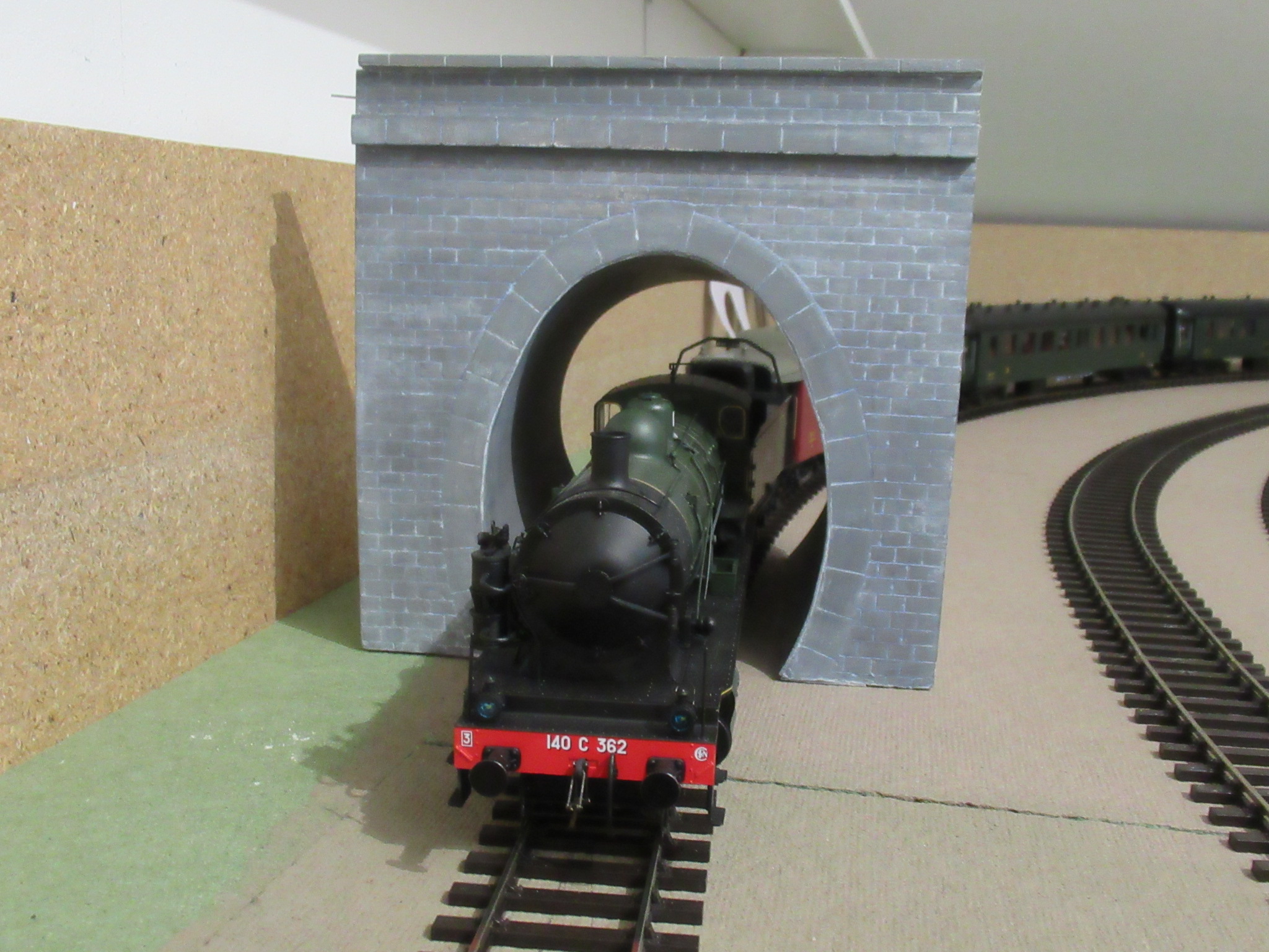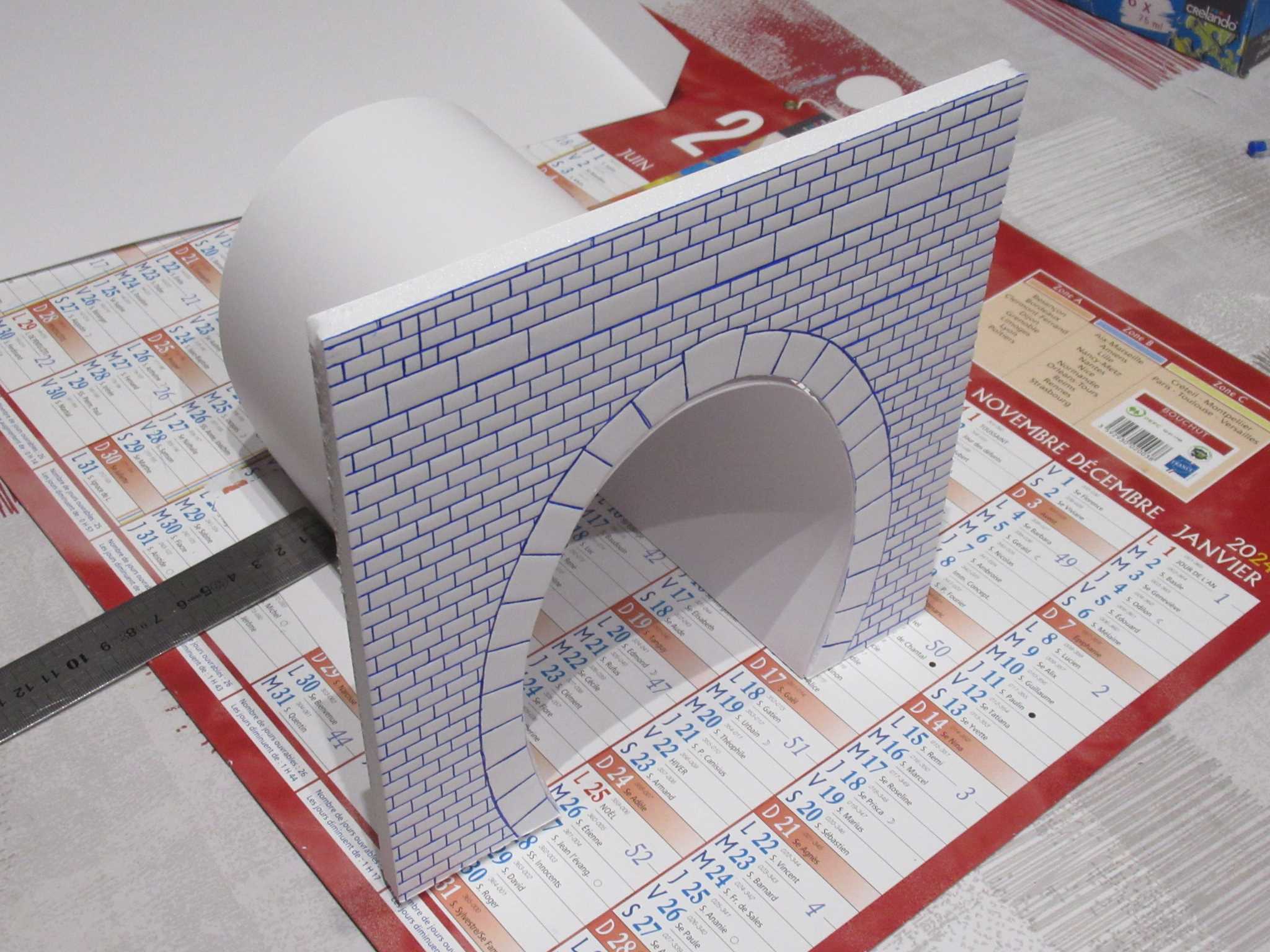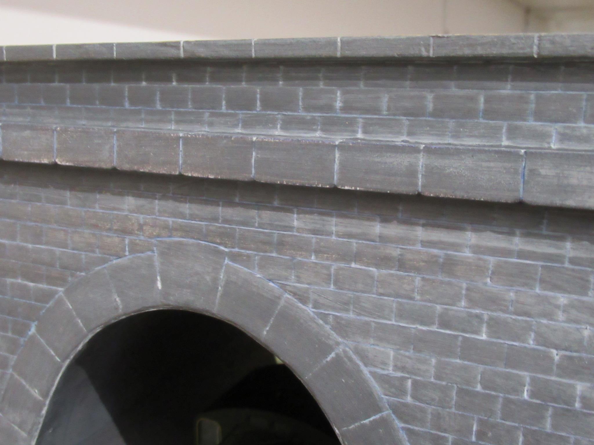 Il n'y a plus qu'à l'accentuer afin de bien marquer cette face. Rajout de bandes plus fines (3 mm et 5 mm) pour donner un peu de relief au dessus de la voûte et en finition du haut de mur. Une bande de carton est collée en arrière de la voûte pour amorcer l'entrée du tunnel.