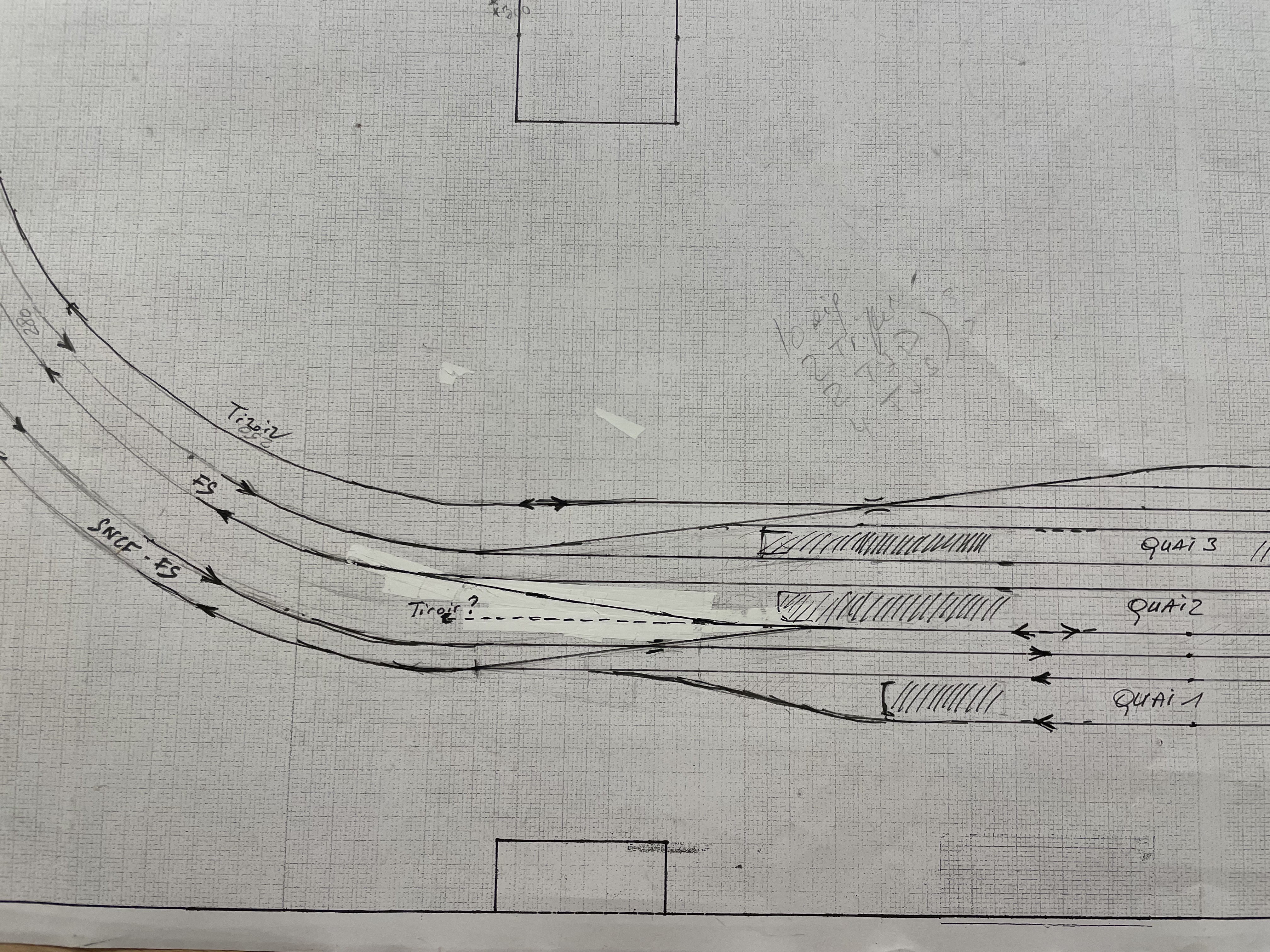 Côté "Est" du réseau: Côté "Ouest": J'hésite sur la nécessité et la vraisemblance des tiroirs. Ceux-ci permettraient de garer la machine qui transférerait une rame du réseau SNCF au réseau FS. À cogiter.