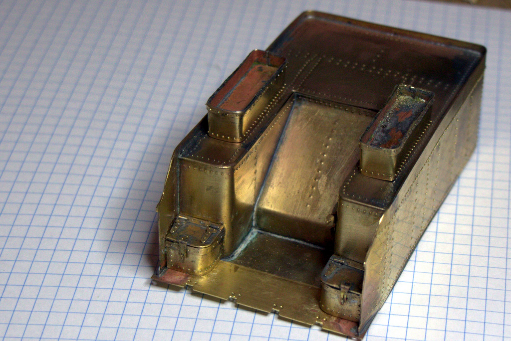 Une petite photo quand même, la plateforme du tender est faite, les encoches sont là pour accueillir les charnière de la tôle relevable entre tender et loco. Derrière cette plateforme, devant la trémie, viendra un plancher en bois d'où le décalage de hauteur.