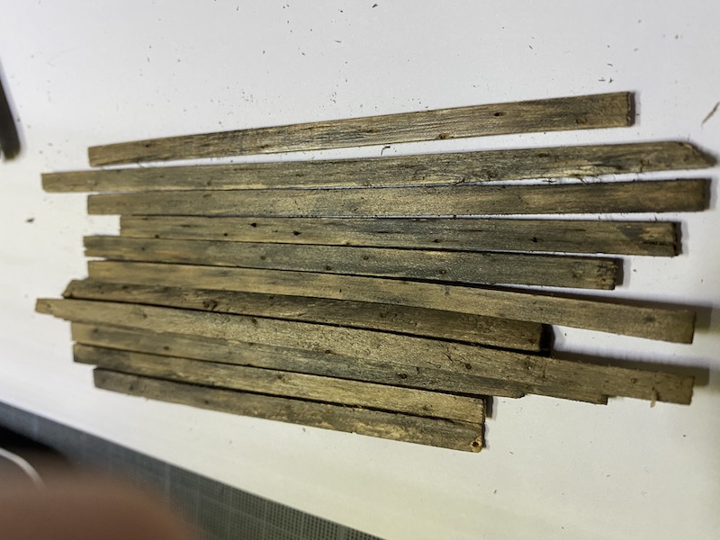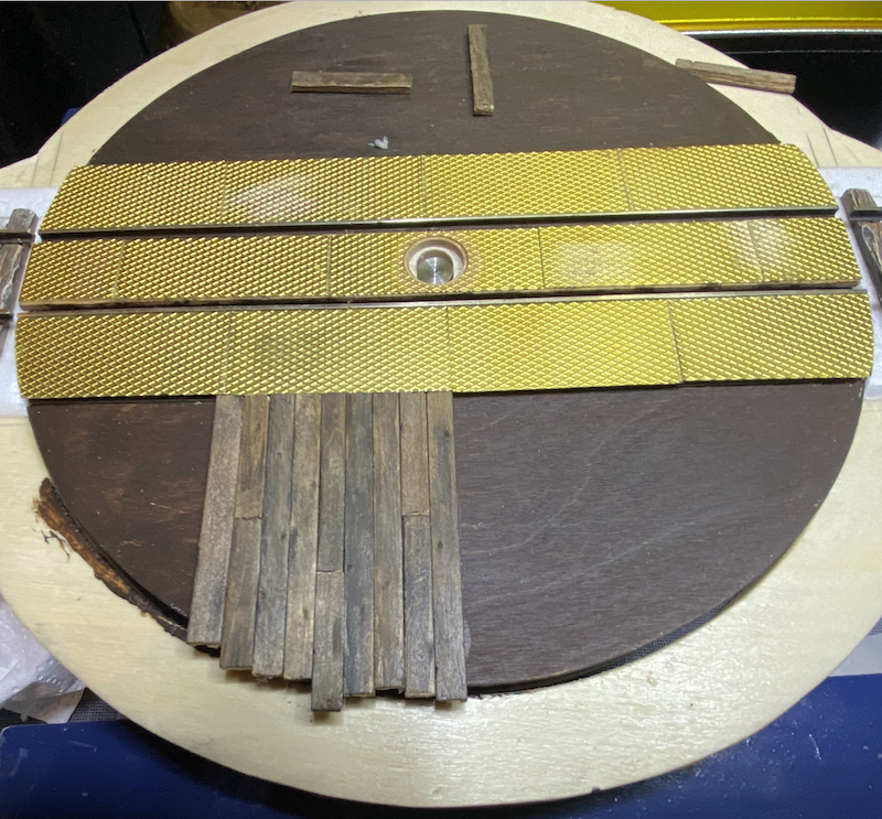 Début du revêtement de la plaque tournante, avec la fixation des lattes précédemment fabriquées.