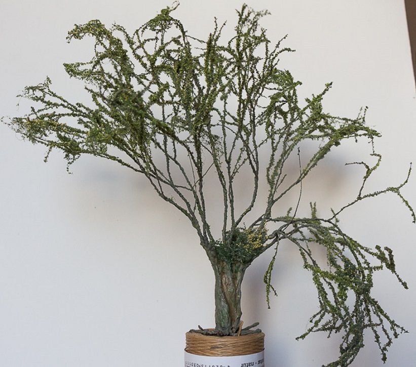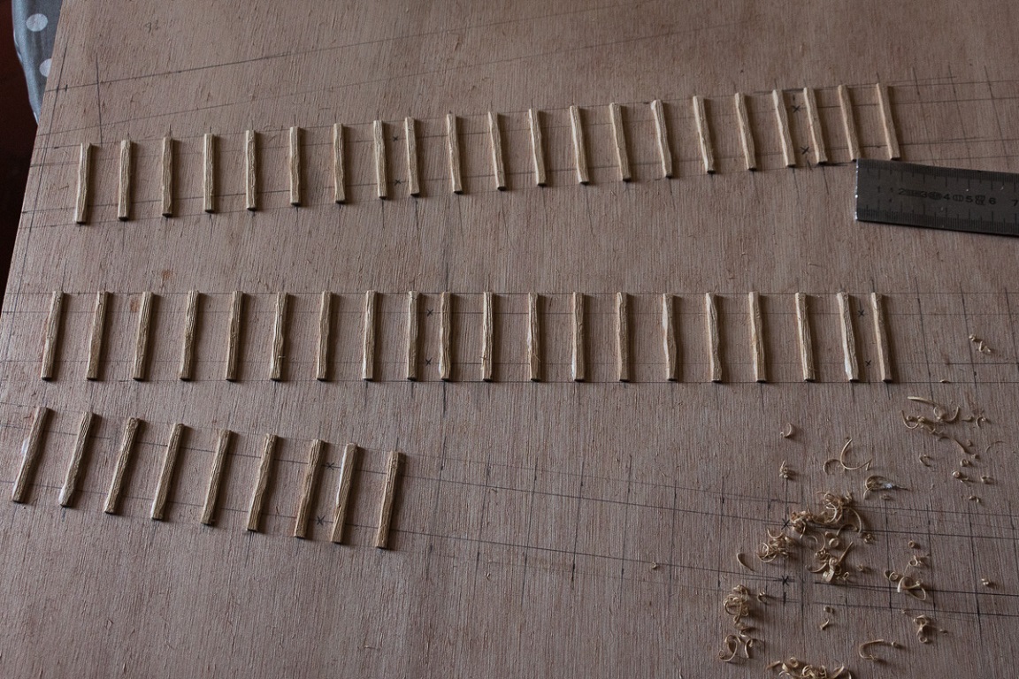 Ce matin encollage des feuilles, plusieurs couches nécessaires pour faire du volume, il y a très peu de filet car les feuilles poussent très près des branches.