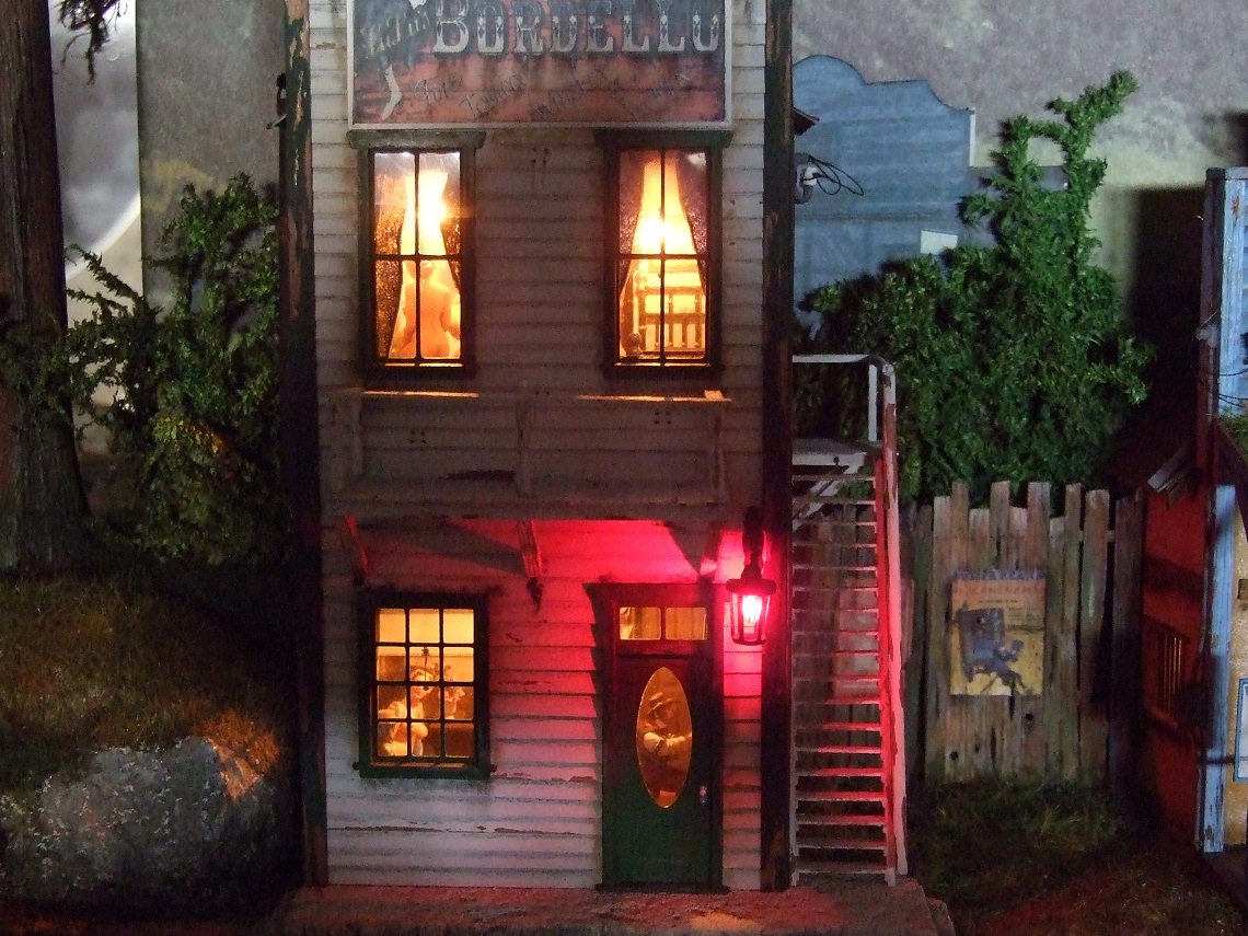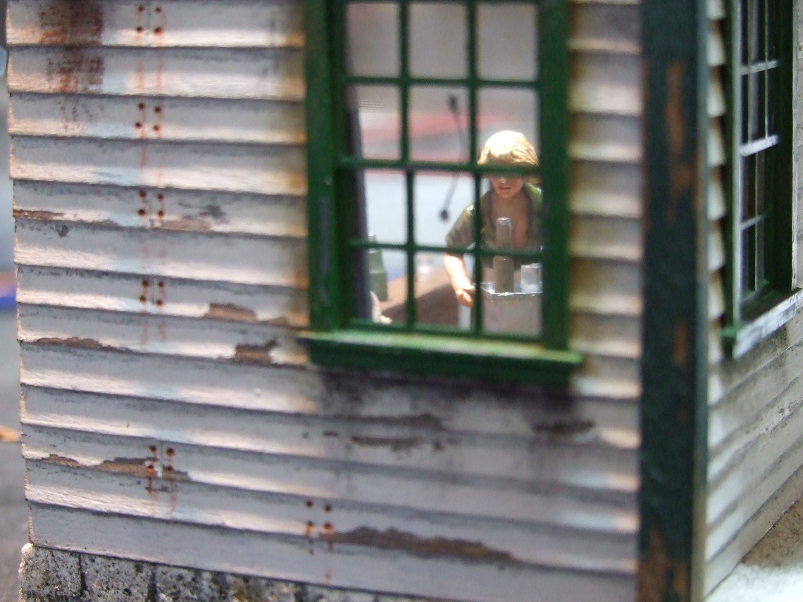 Si celui-ci me convient, je colle à la cyano-gel les figurines voir aussi les accessoires. Le pianiste se distingue parfaitement à travers la vitre de la porte d'entrée. Idem aussi pour les figurines assises sur la méridienne. Ainsi que la serveuse; toutes ces photos ont été prises en super macro sans le flash. Une autre vue en contre plongée; la tenancière est pas encore placée, sa robe étant pas tout à fait sèche.