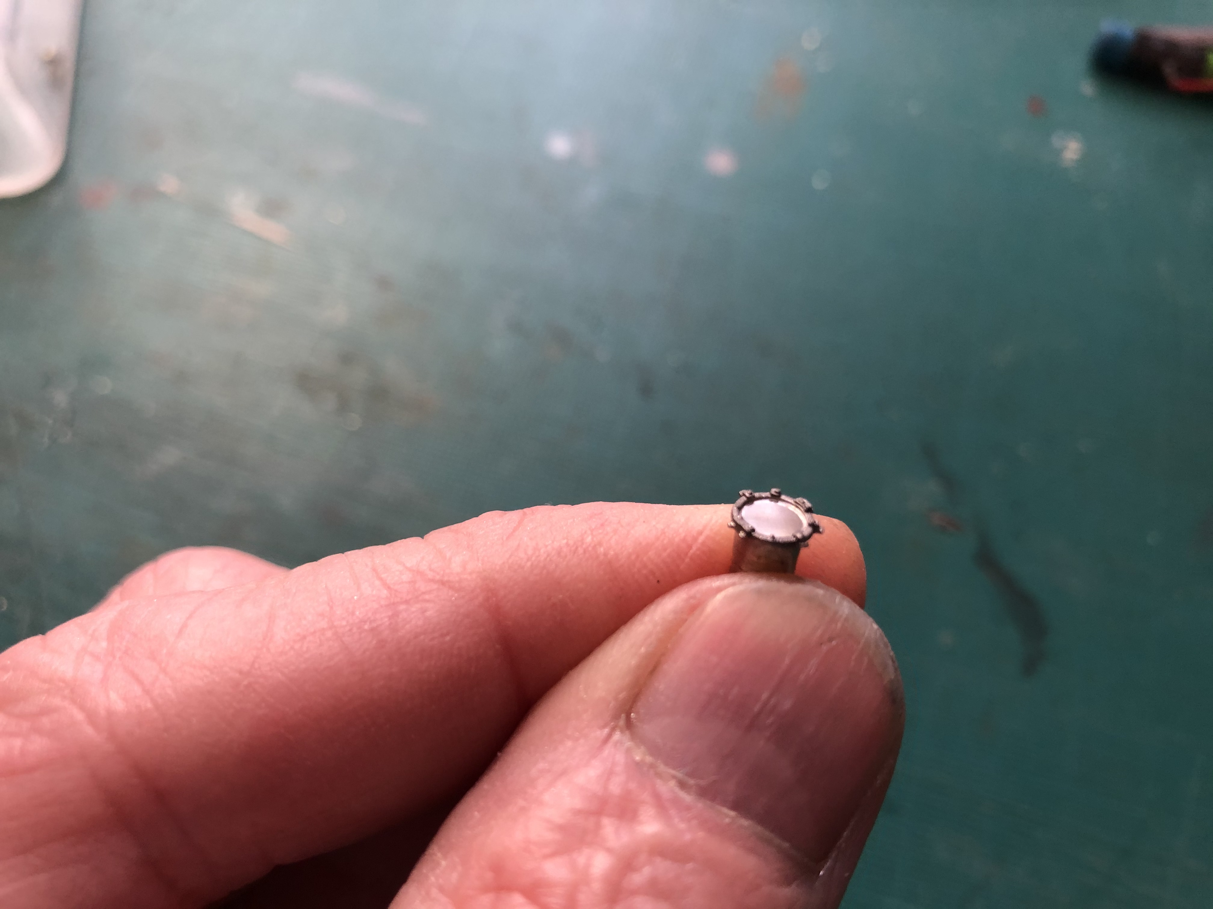 (le nouveau verre est celui qui reçoit le reflet de la lampe. Les autres ont été peinturlurés accidentellement pendant mes essais de patine)