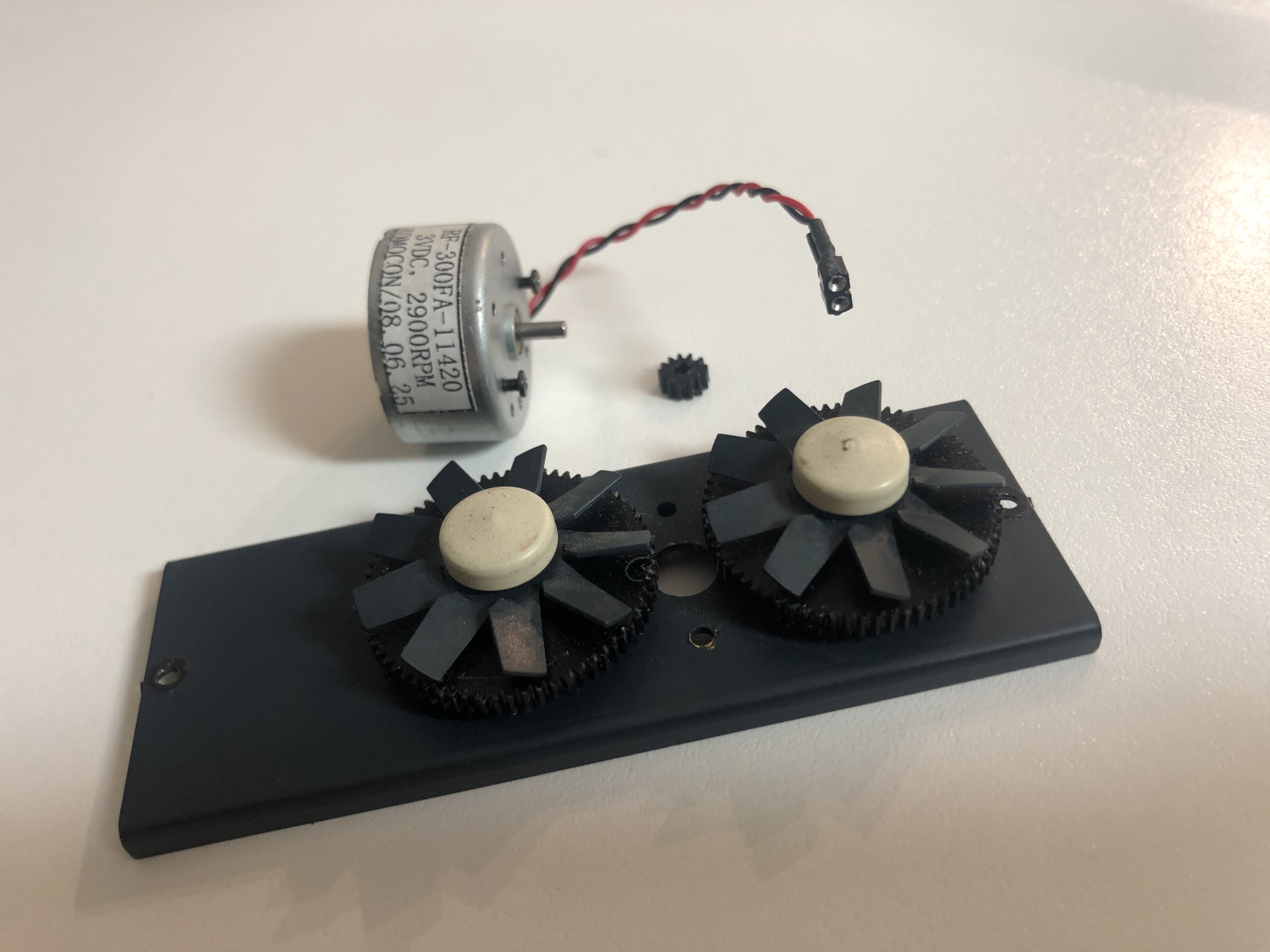 Eh non.... j'avais oublié de câbler le petit moteur du ventilo. Donc ce matin bingo (!) , je rouvre la machine pour brancher le dit moteur mais impossible de faire tourner les ailettes. La petite roue dentée fixée sur l'arbre moteur est fendue (elle vient normalement attaquer les 2 roues placées sous les 2 ventilateurs) et visiblement à l'origine du blocage générale.