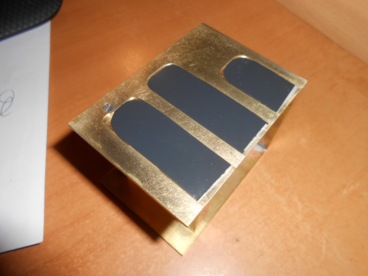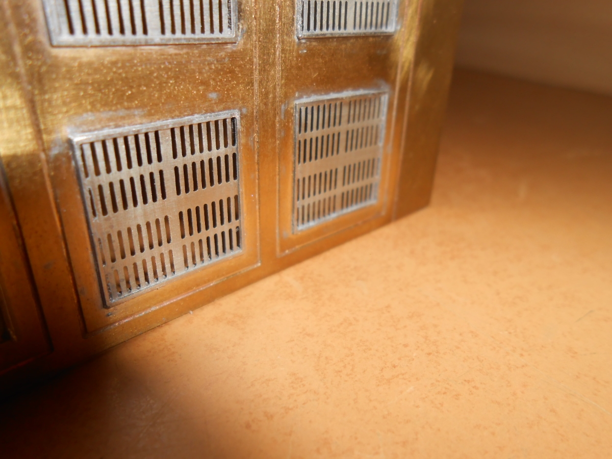 On vient insérer par le dessous, ces bidules en plastique, simple feuille de plastique peint en noir, entre la structure et la finition, permettant d'avoir les trous des grilles noir.
