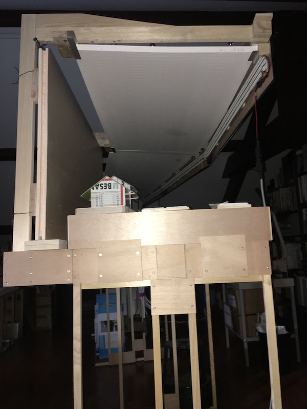 Quant à la toile tendue, même si j’ai du abandonner ce que j’avais envisagé (le revêtement de sol utilisé, trop lourd, est en réalité inapproprié), je garde l’idée, et je chercherai plus tard une toile légère, qui pourrait être tendue avec un fil lestant le bas de la toile.