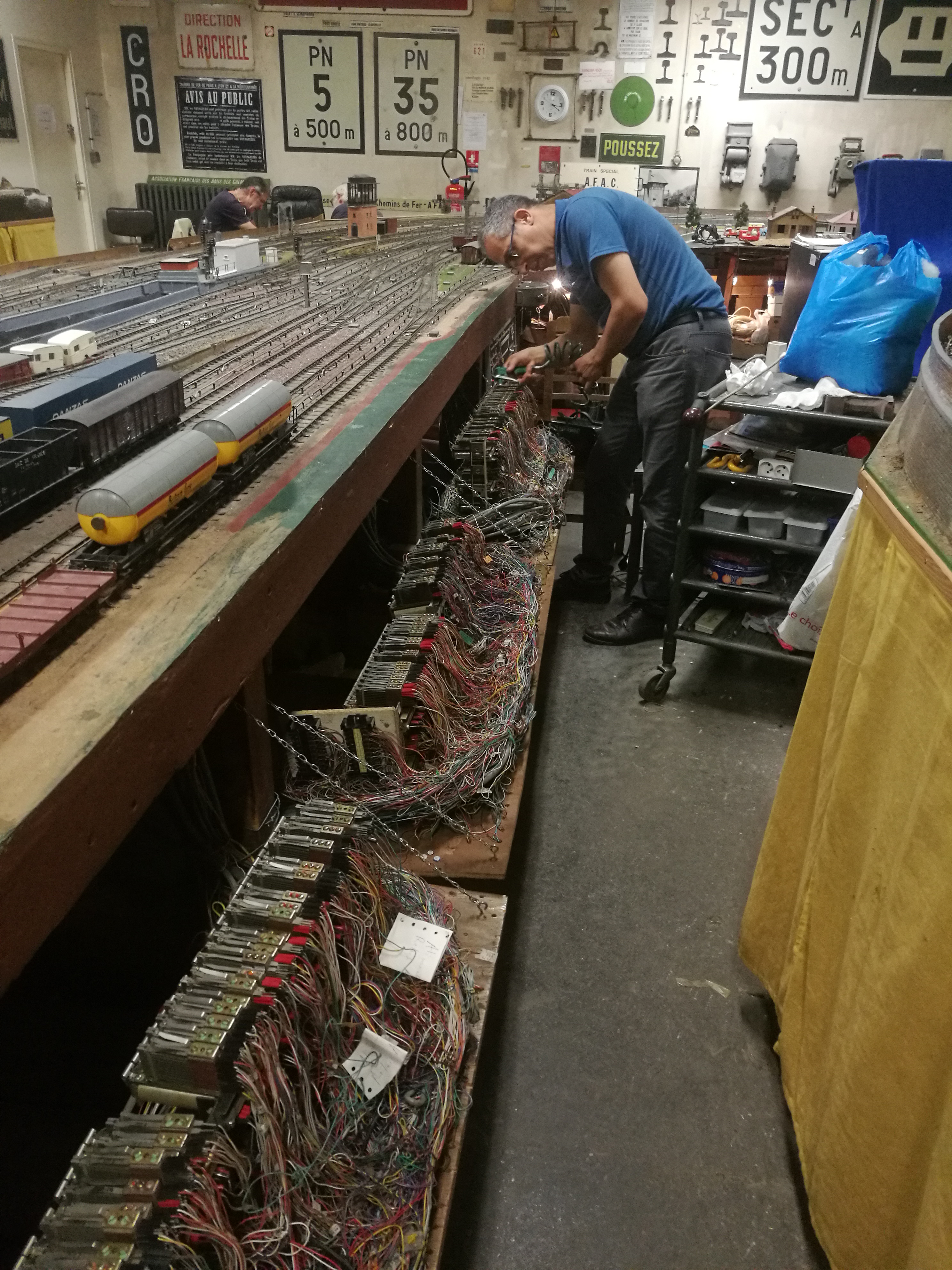 Haaaa,l'entretien, une partie du modélisme qui est primordiale dans le maintien d'un réseau en bon état surtout à cette envergure ! Il faut d'abord nettoyer la totalité des voies pour éviter que les machines bloquent et/ou s'encrassent, 485 mètres de voies à frotter dont des parties qui n'ont pas été faites depuis fort longtemps du fait de leur accessibilité, il en reste encore à faire qui le sera samedi prochain pour pouvoir faire une grande journée de circulation. Mais pour pouvoir faire rouler, d'autres éléments doivent être nettoyés : Les Relais, les 1500 relais ont été passés à la soufflette, on a fait voler la poussière puisque je pense que ça n'a pas été fait depuis fort longtemps, elle deviendra une tache récurrente pour éviter les problèmes du genre "appuyer plusieurs fois sur les mêmes boutons pour faire les itinéraires" (par exemple).