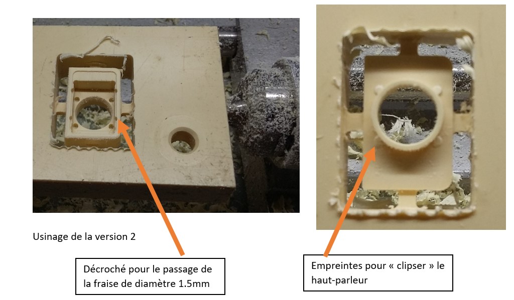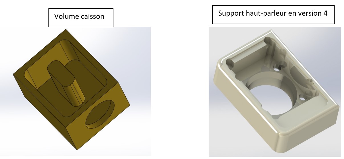J’ai modélisé à partir de mesures le « volume caisson » et modifié le support du haut-parleur qui a évolué suite aux essais de montage du haut-parleur, (décroché pour cadre de maintien, montage « en légère force », matériau :