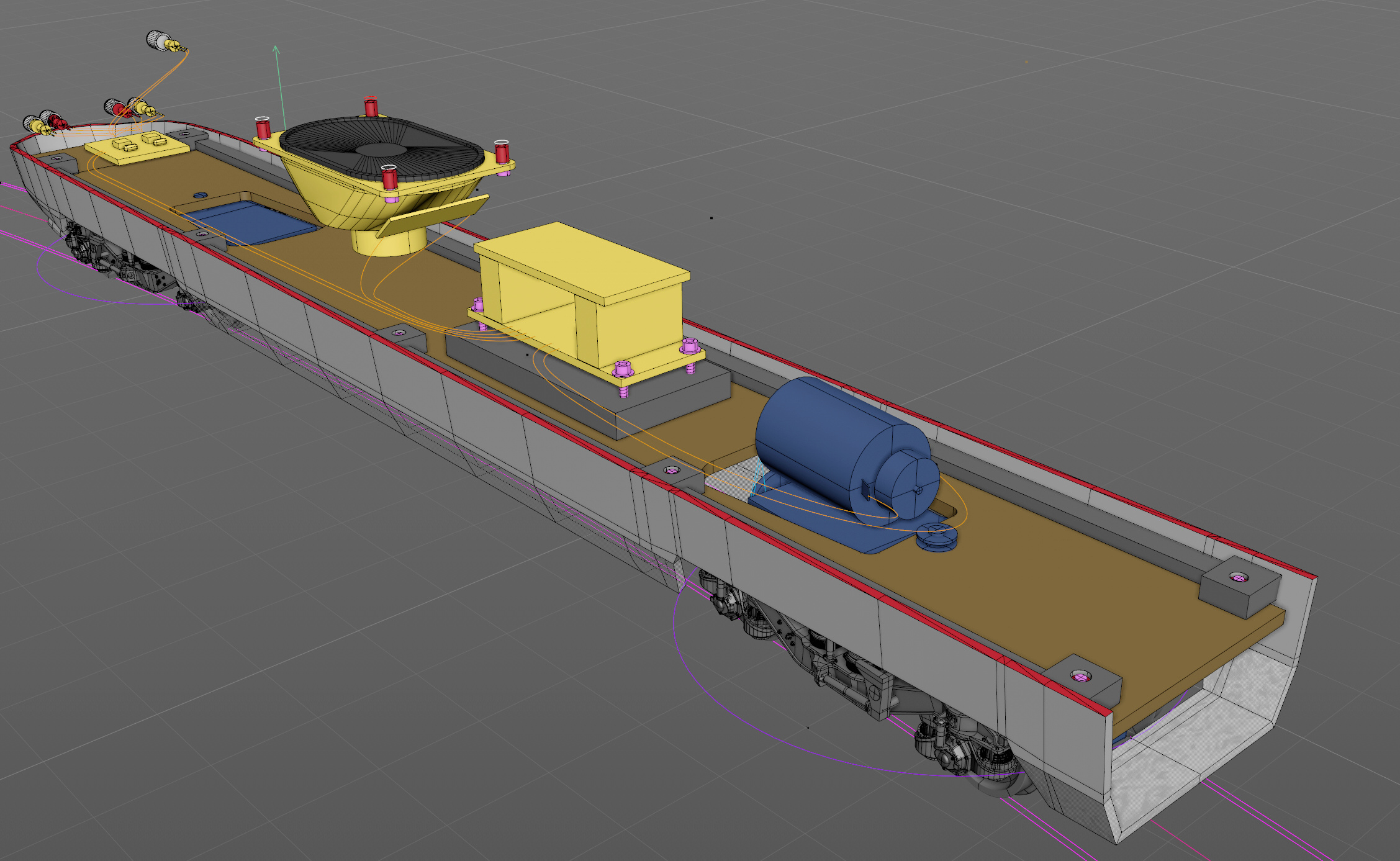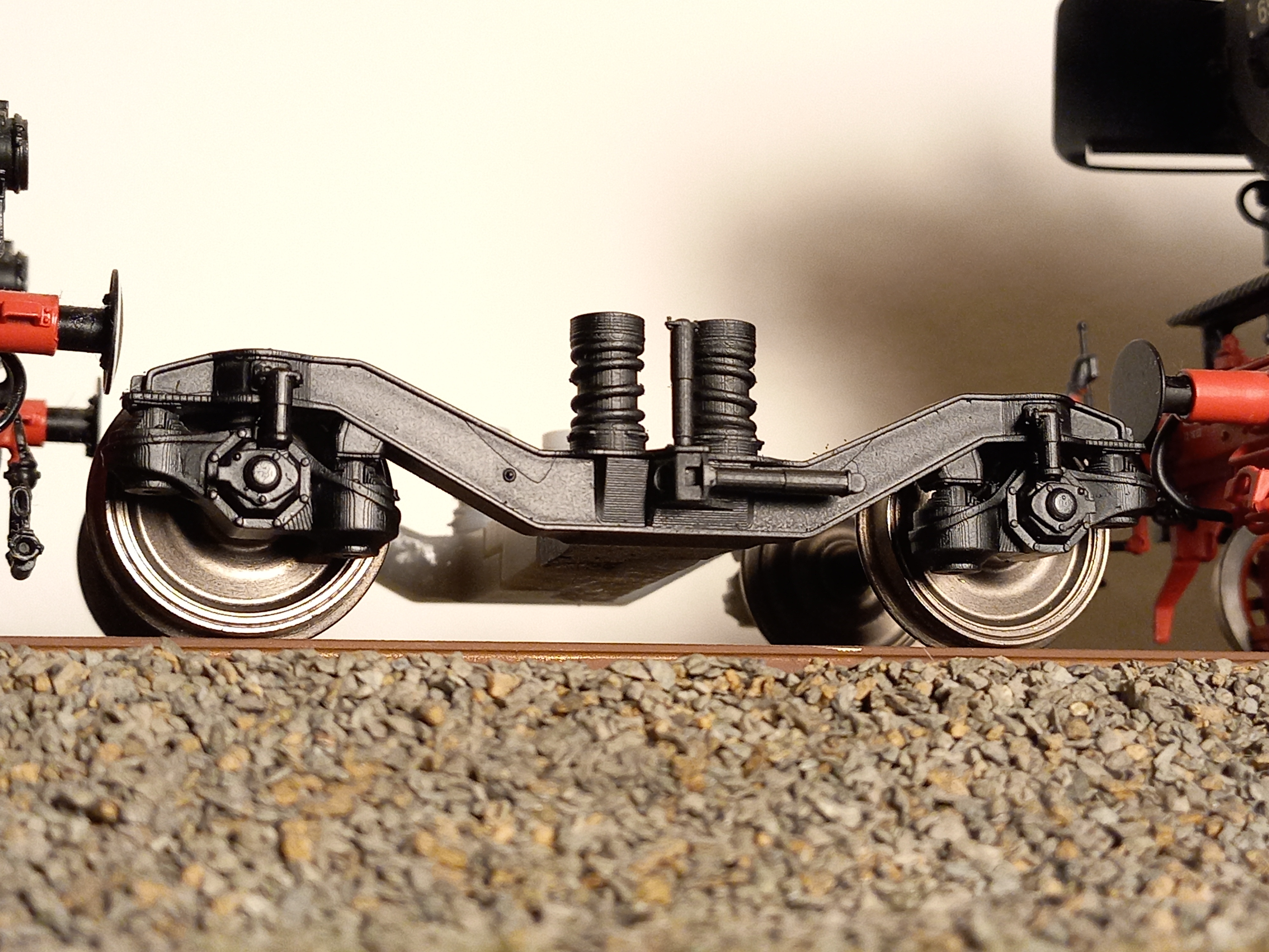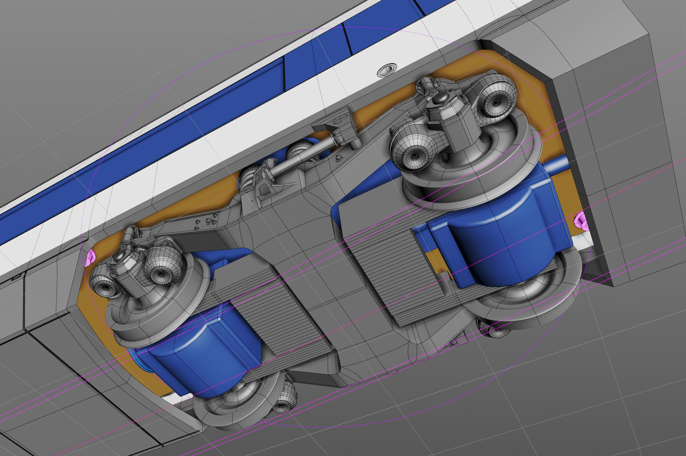 Test de peinture sur le bogie et modélisation / insértion des moteurs de traction. Il y aura là deux variantes pour le bogie motorisé et celui non motorisé....