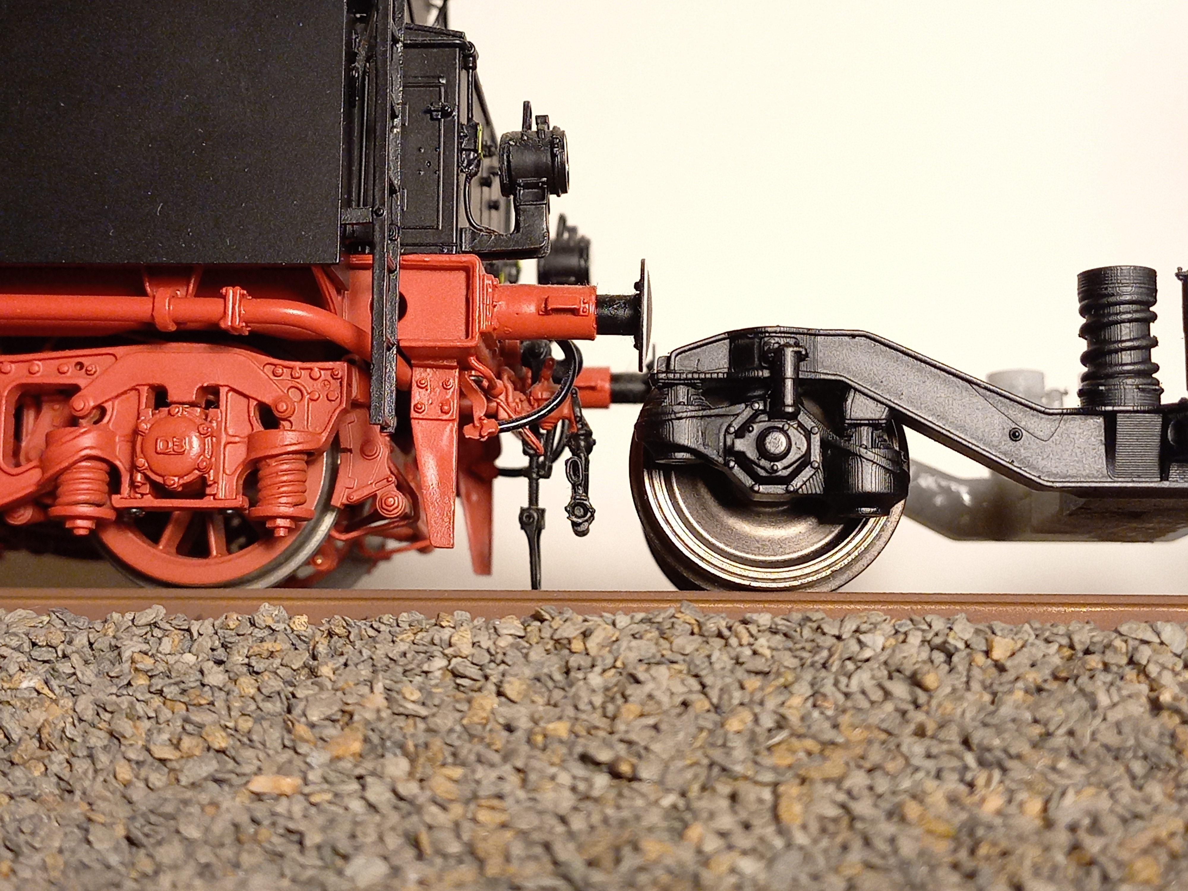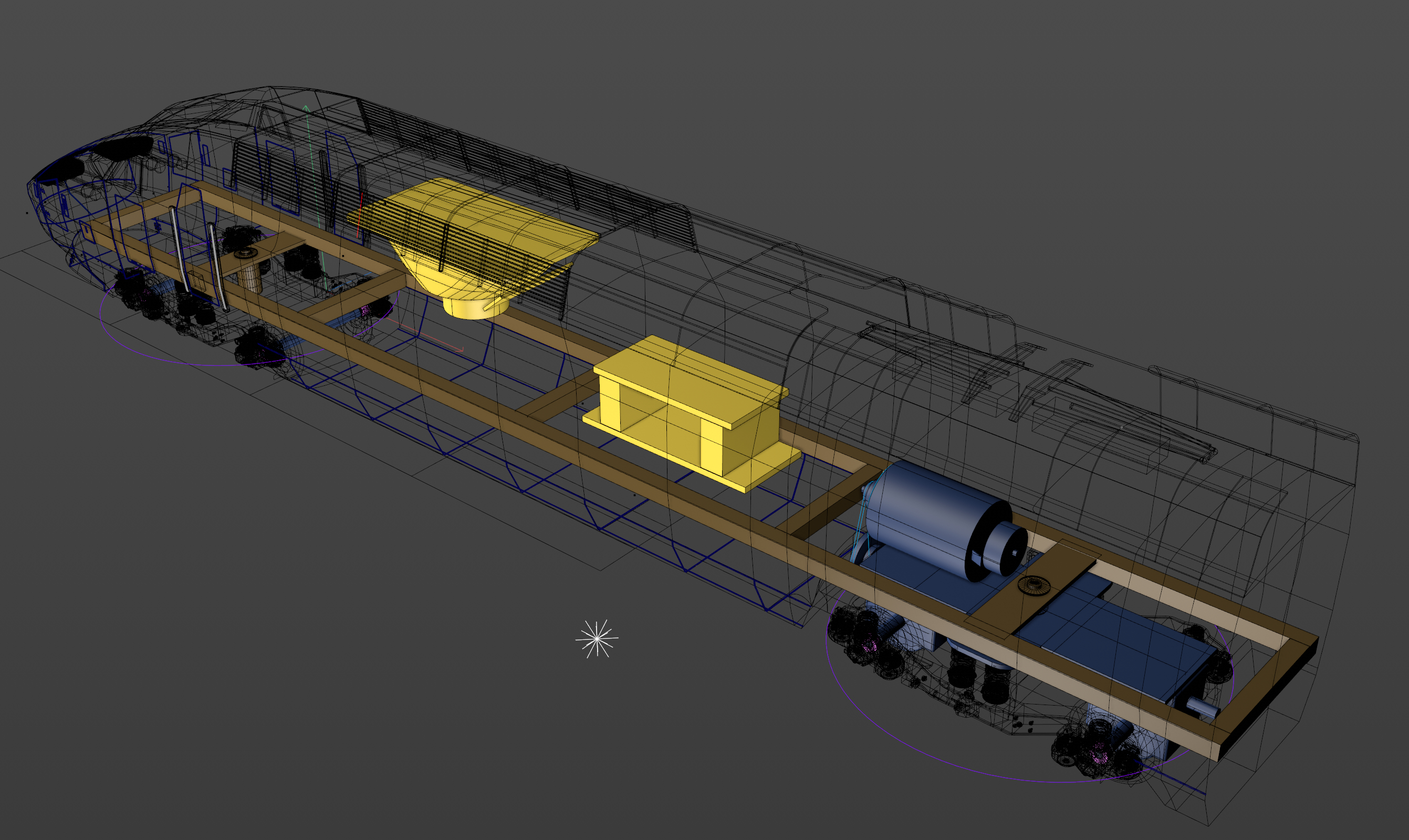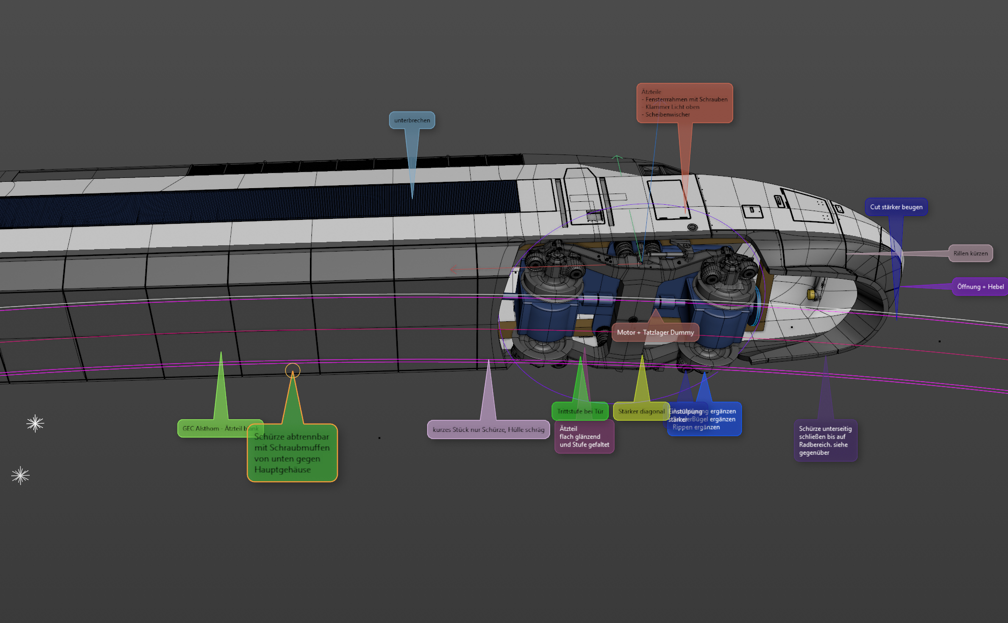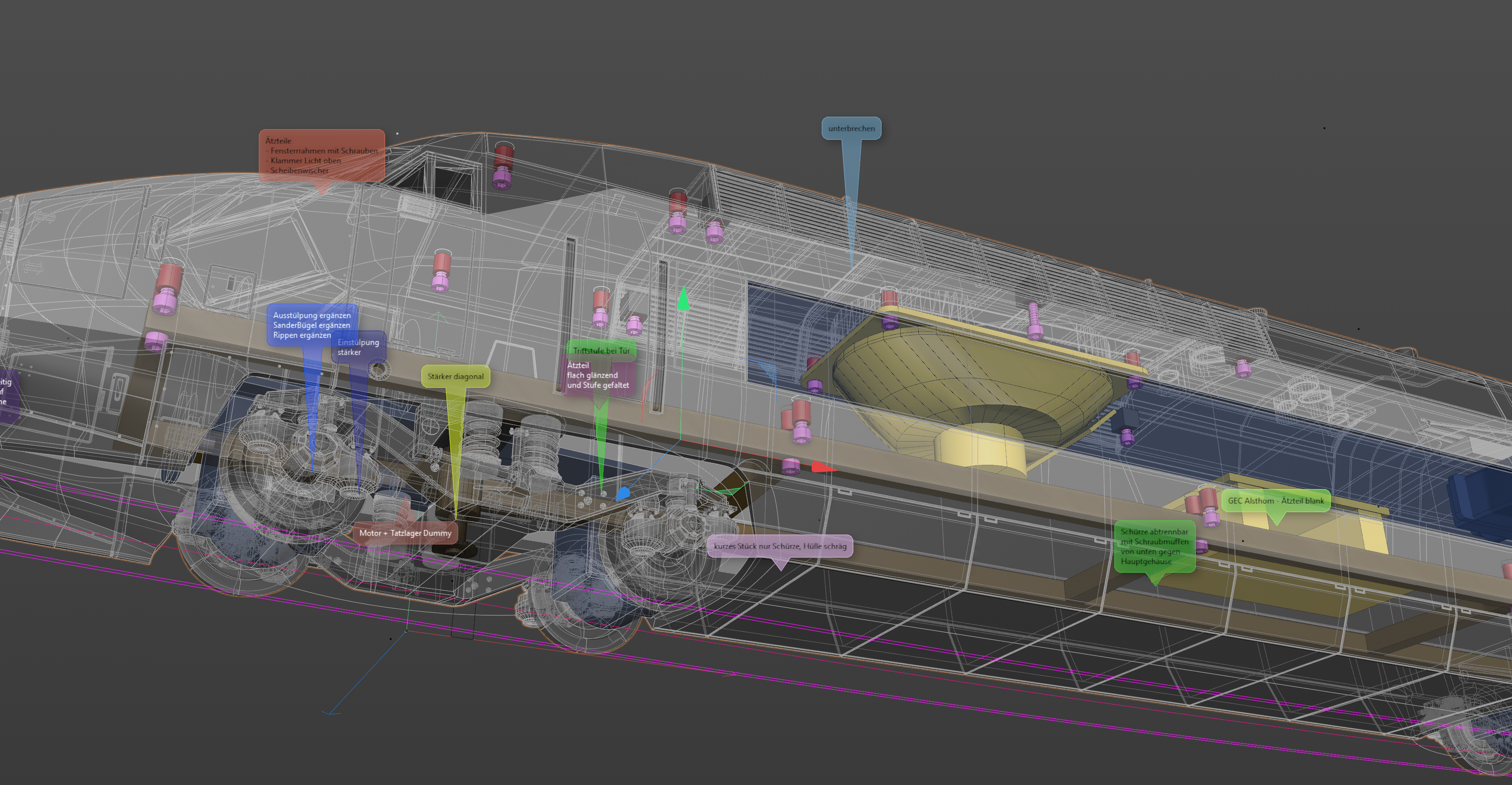 Test de peinture sur le bogie et modélisation / insértion des moteurs de traction. Il y aura là deux variantes pour le bogie motorisé et celui non motorisé....