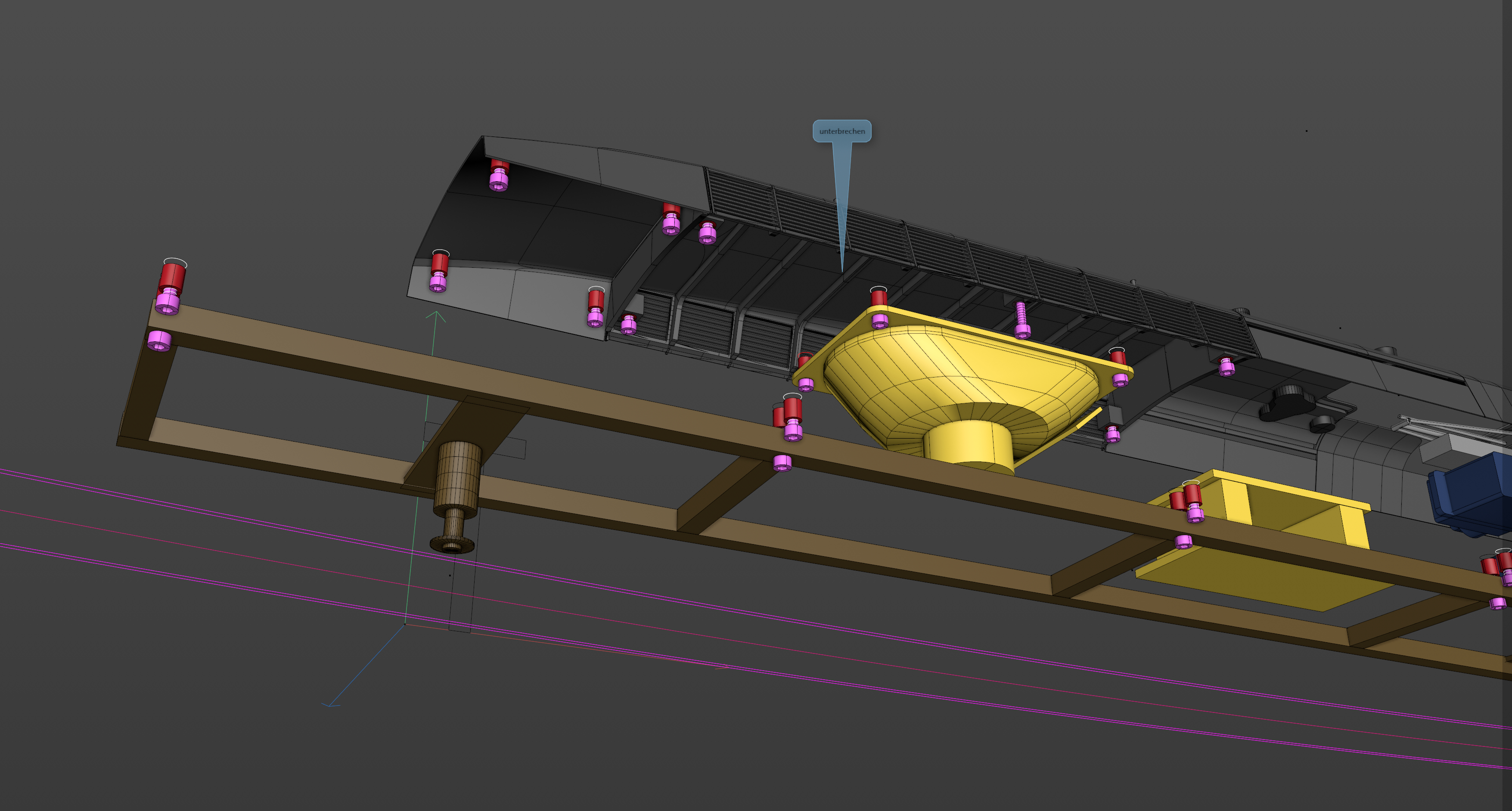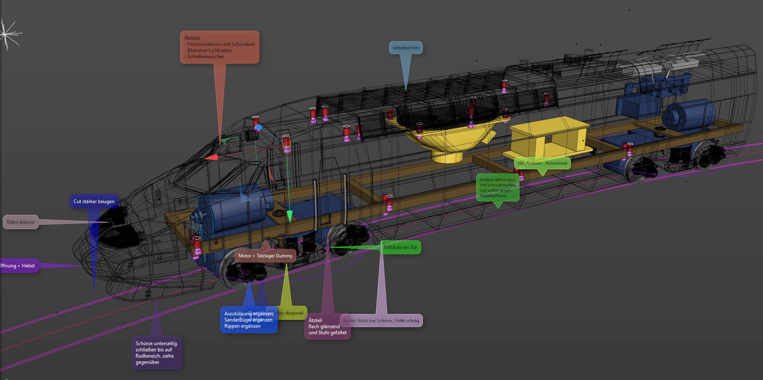 Les bogies avec moteur ou sans y seront attachés de même que la partie principale (avec les carénages du toit ) posée sur la plaque et vissé par le bas. Puis les pièces du bas.