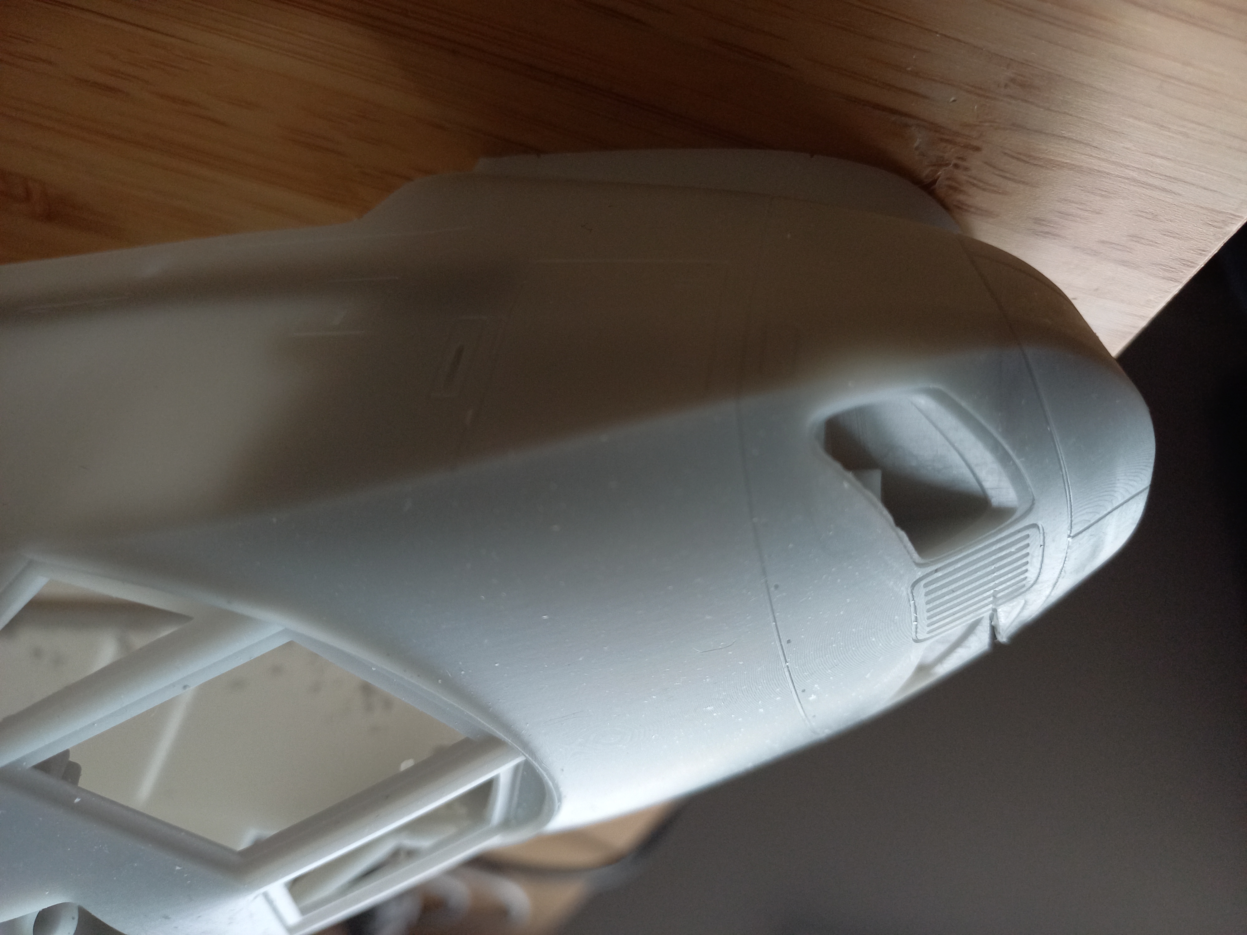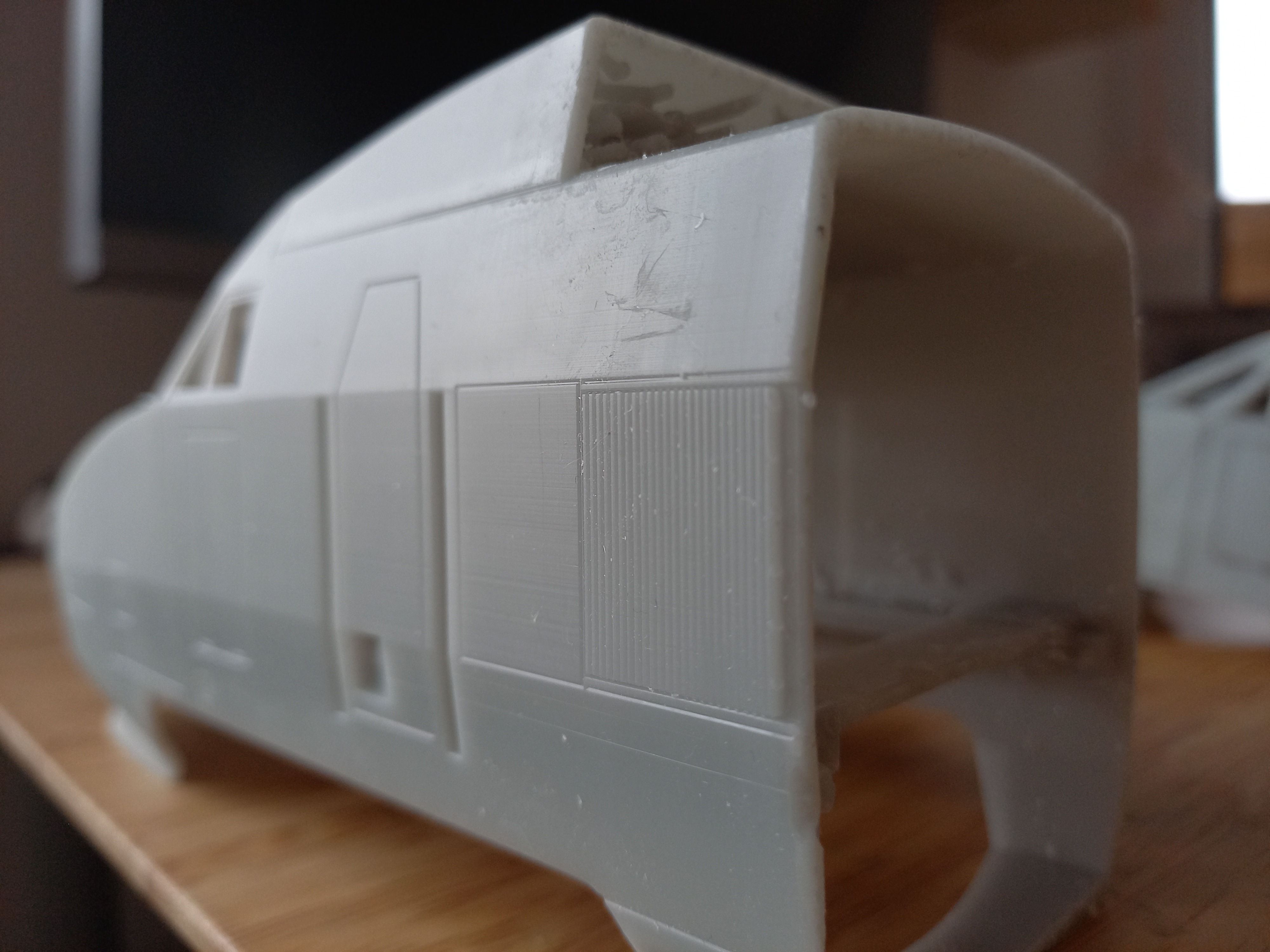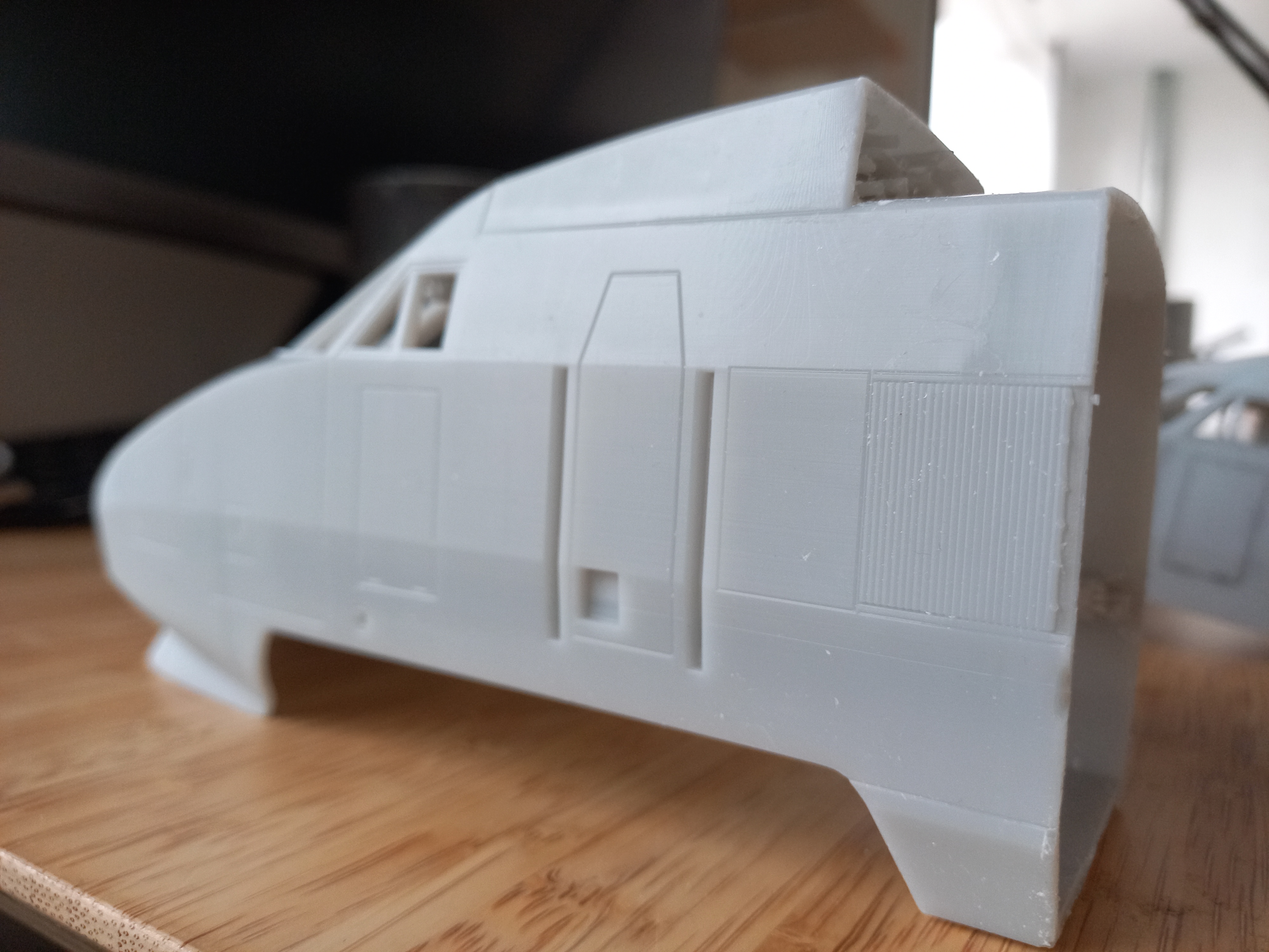 Encore un test à l'imprimante, même pièce qu'auparavant avec joints plus accentués, et un peu plus long, phares percés et 3ème phare en toiture et en plus la pièce avec les lamelles en toiture...