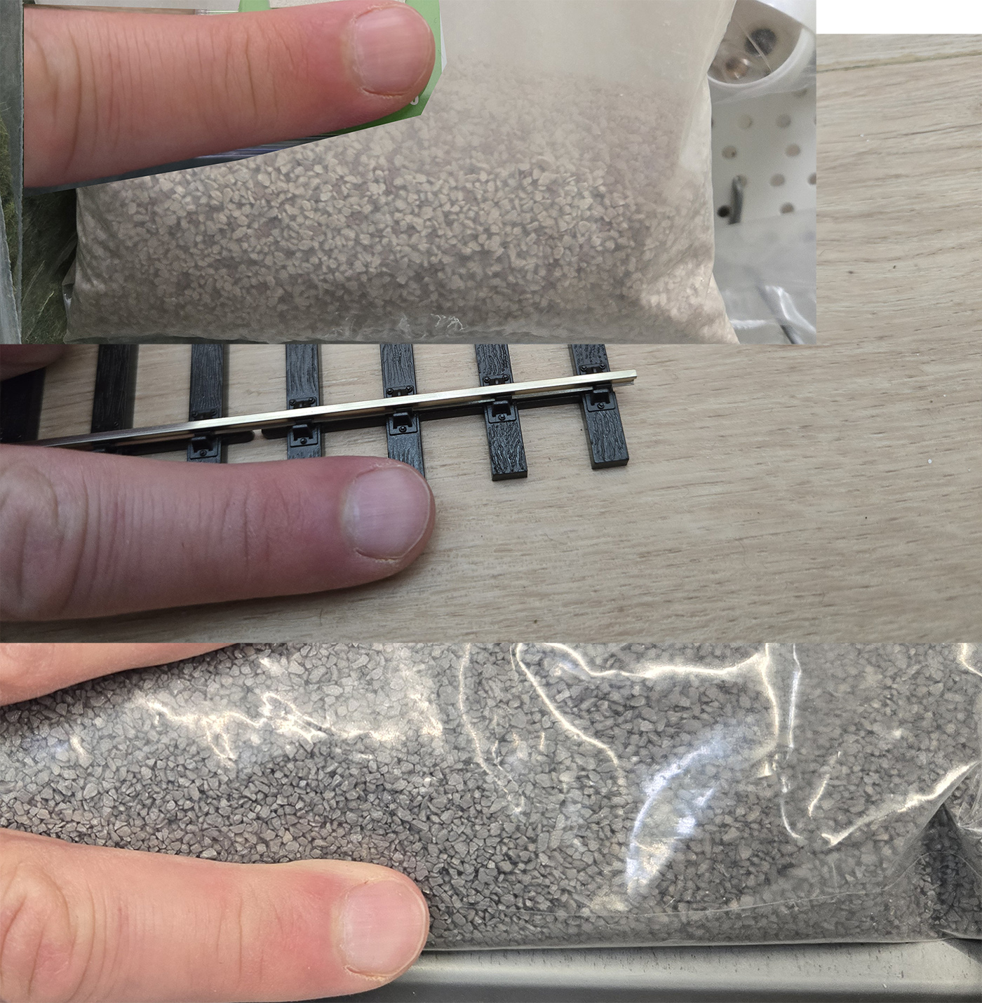 Sinon, sur un autre point, je me suis tout à coup posé la question du ballast. Je vois que le ballast Peco à l'échelle 0 possède une granulométrie de 1 à 2mm, et est fourni en petits sachets de 250g qui se négocient pour la modique somme de 5,90€, or il me semble bien qu'il en faille un seau pour ballaster 3m de voie à cette échelle.