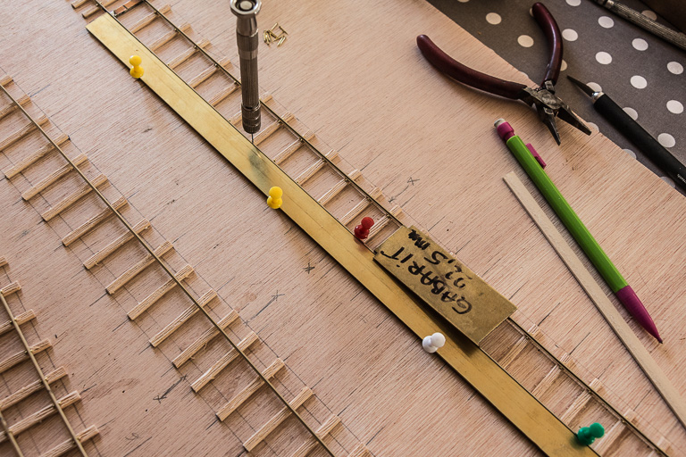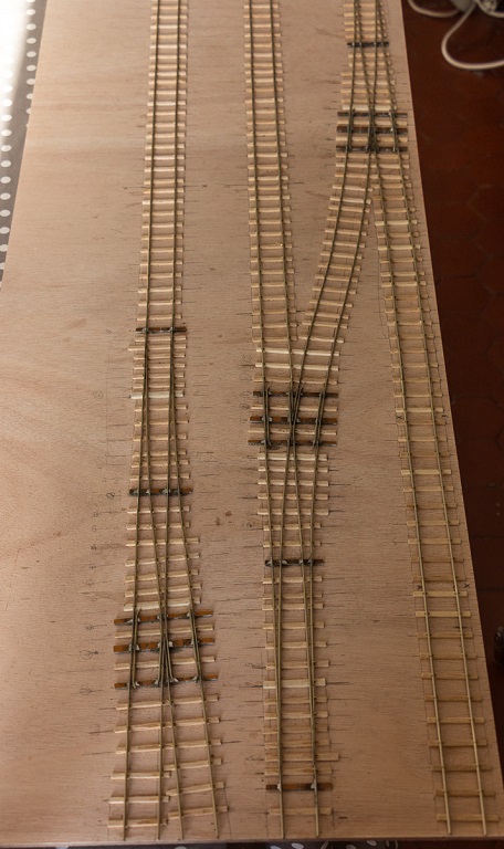 Même si la pose des rails est faite sur trois modules, les travaux sont loin d'être terminés. Je dois encore mettre les éclisses tous le 18, 4 cm après avoir fait des entailles dans le rail. Prévoir : les alimentations des rails et des reprises d'alimentation au niveau de leur jonctions, les alimentations des moteurs d'aiguillages et des pointes de cœur, les barres d'accouplement des lames, etc etc...