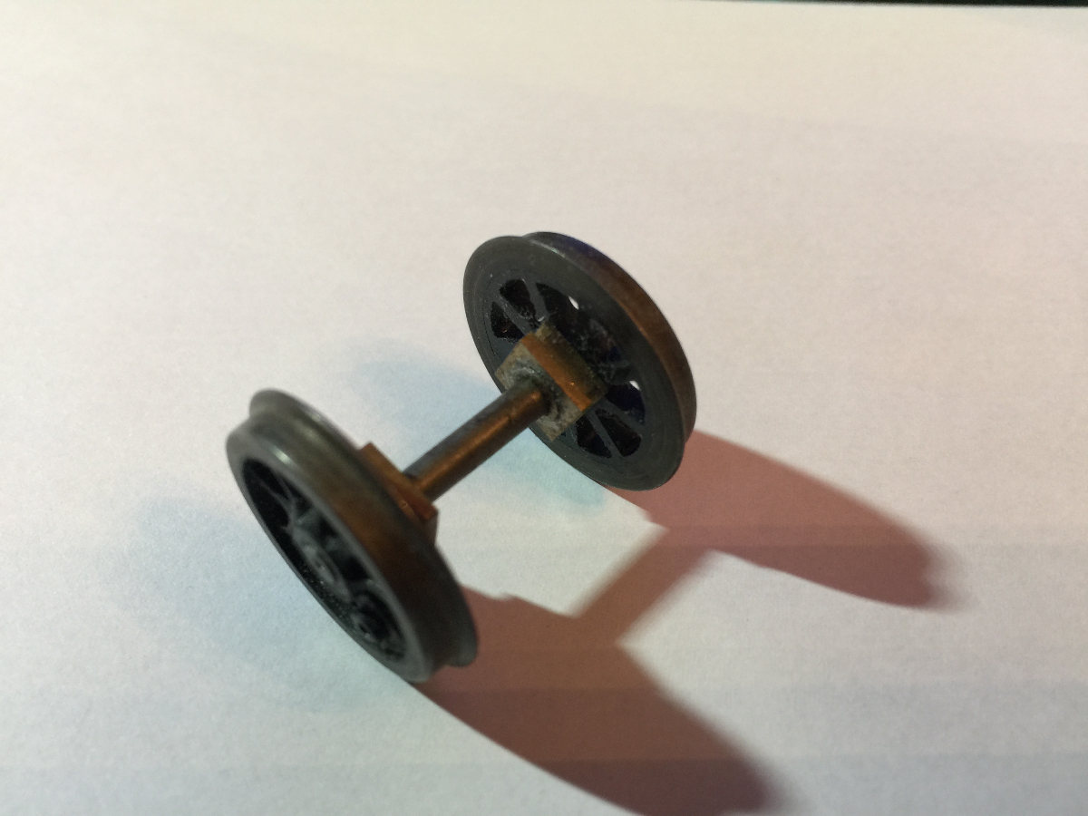 Un gros plan d'essieu avec la boite et l'épaulement de la bague de réduction. Tu vois aussi comment est montée la boite d'essieu et les bandages de roues sont noircis pour éviter la corrosion