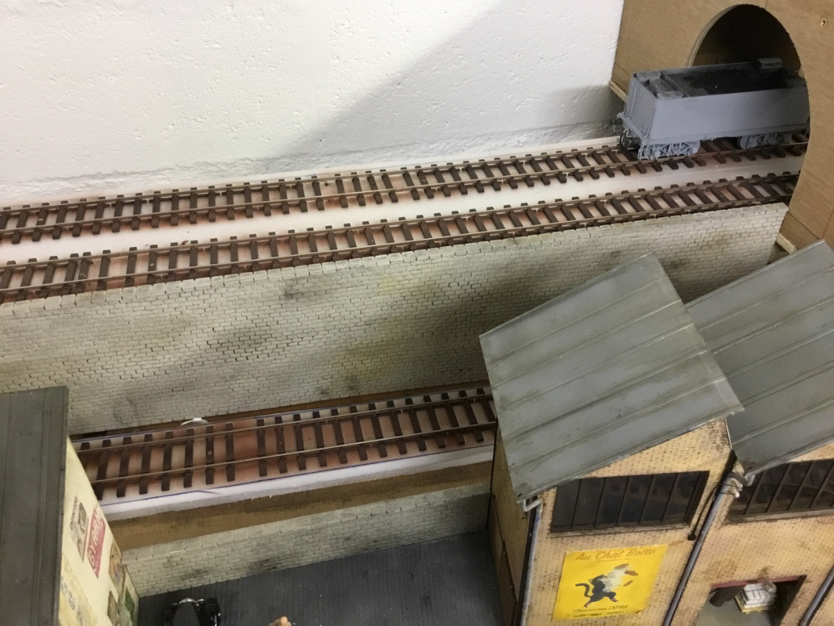 J'ai contrecollé le dépron sur un carton de 1,5mm pour lui donner de la rigidité. Le tout est fixé à la colle vynil sur les tasseaux de la structure du reseau. Ça commence à prendre tournure, même s'il y a encore du boulot avant de passer aux signaux et autres accessoires de voies.
