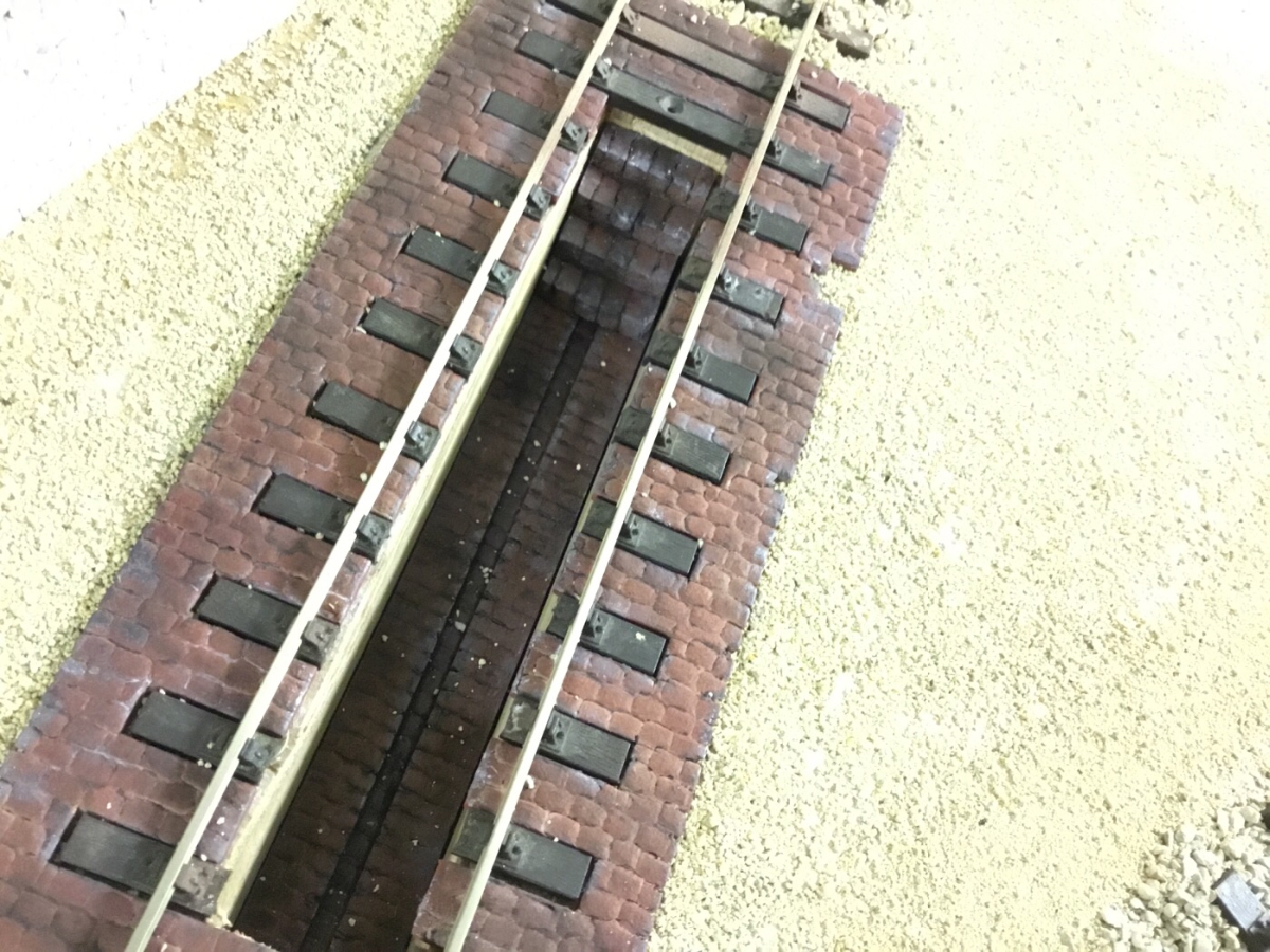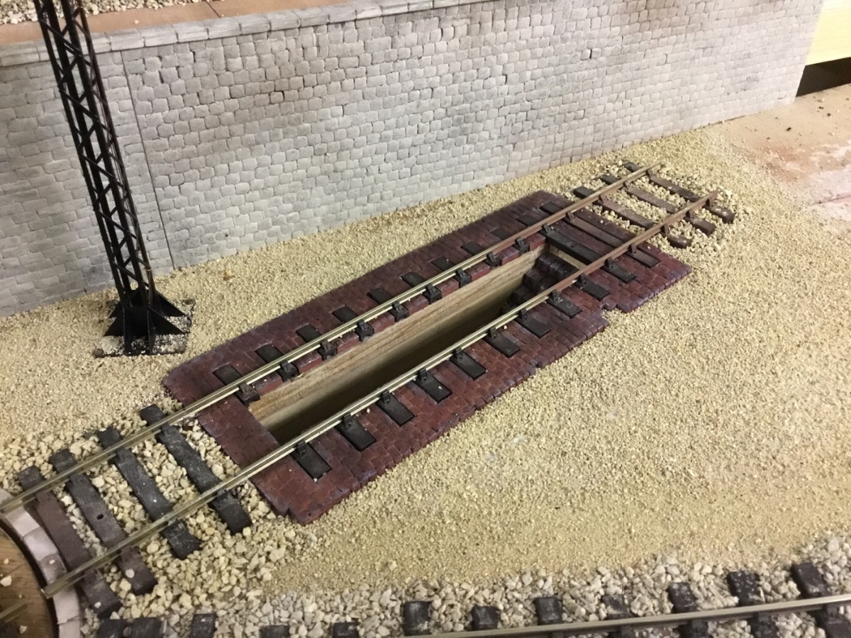 Une première peinture et patine ont été appliquées. Le tout est en place et un premier revêtement de gravier fin sert de base pour la suite. J'avais préparé les murs de la fosse en carton façon briques mais ça ne me plait pas du tout la couleur ne va pas...bref on ne gagne pas à chaque coup, je recommence.