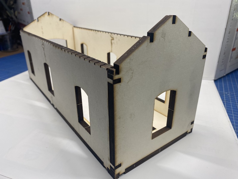 Après mise en peinture à l’acrylique, poursuite de la construction avec l’installation des entourages de fenêtres, des ceintures en pierre haut et bas, après les avoir gravés.