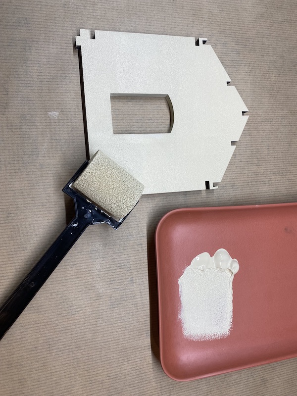 Début de la construction avec la pose au rouleau d’une couche de Gesso pour préparer les surfaces en vue de la peinture.
