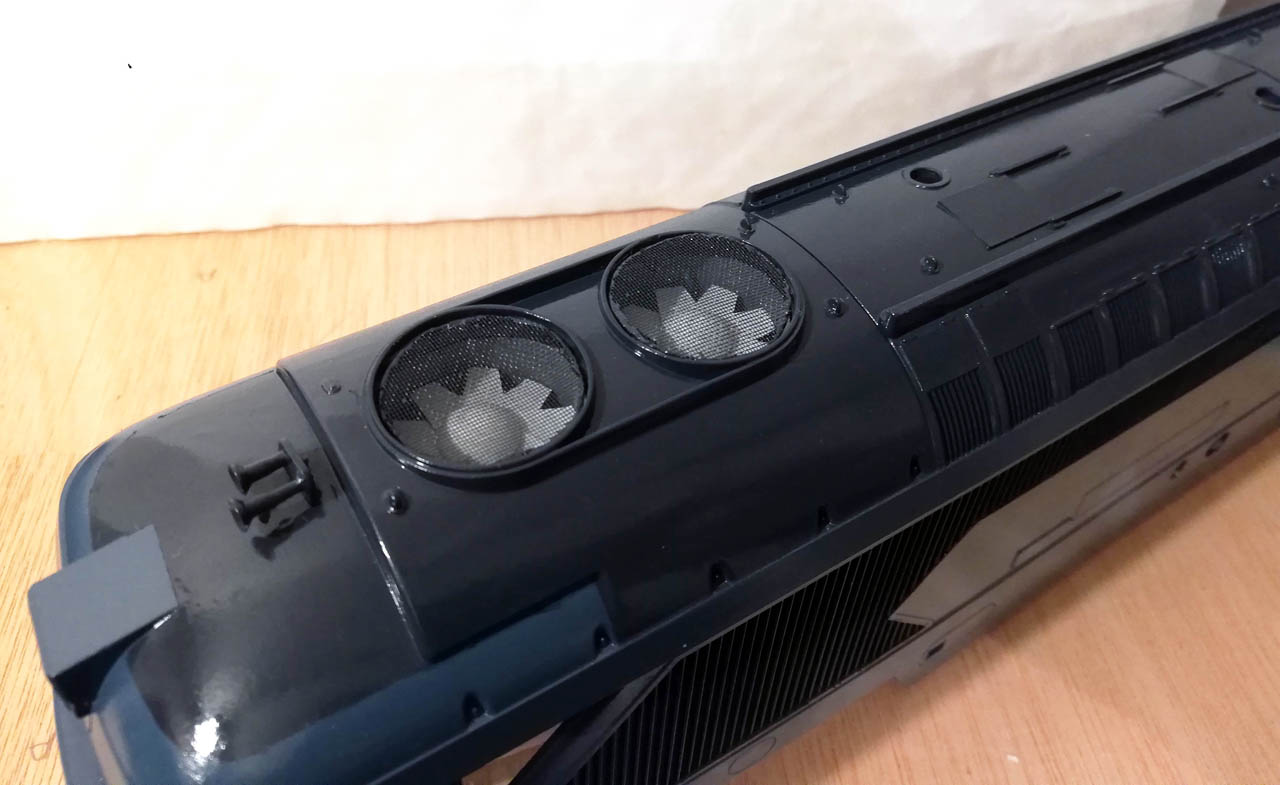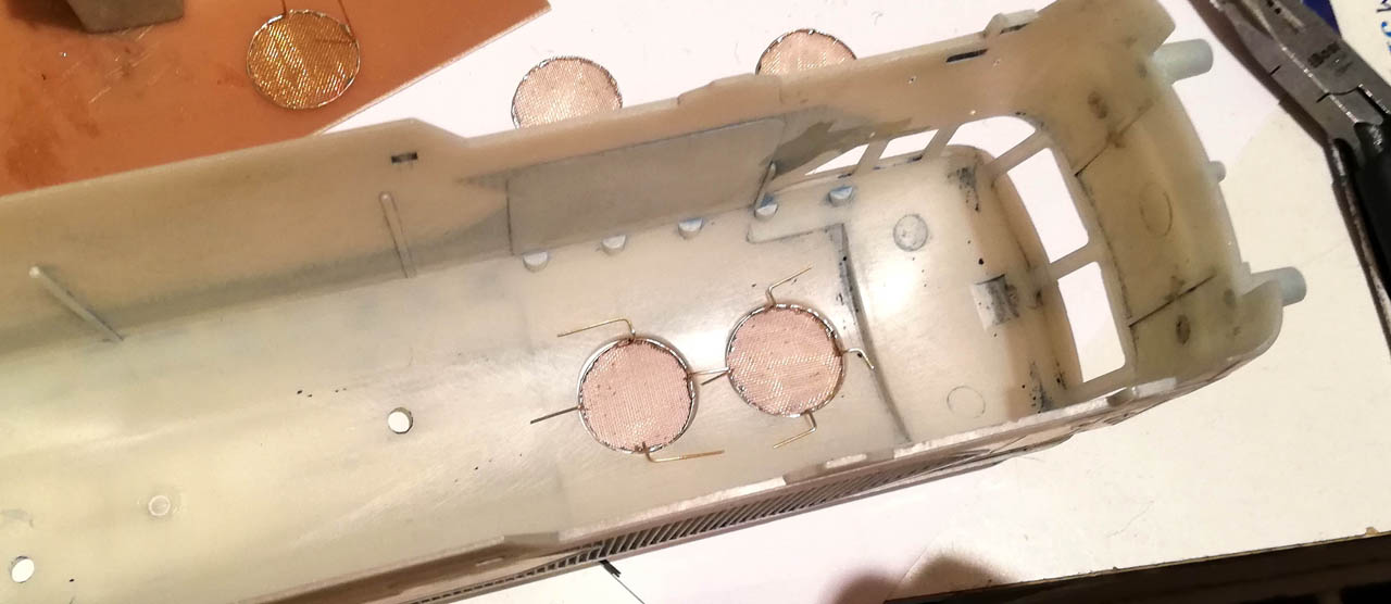 Il suffira de coller les tiges de support à la néoprène transparente à l'intérieur, après peinture de la caisse. La grille de gauche est trop petite et sera changée. .