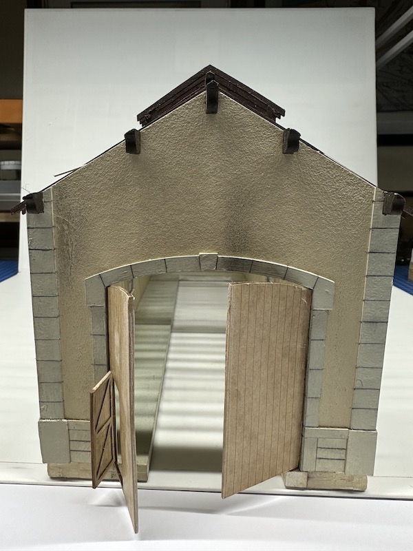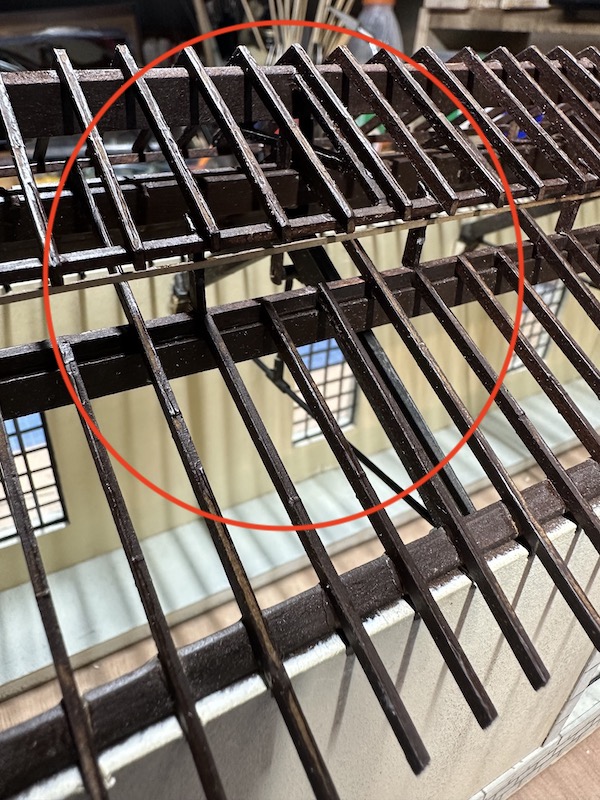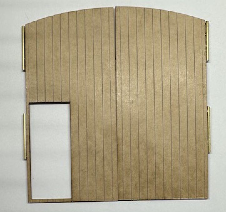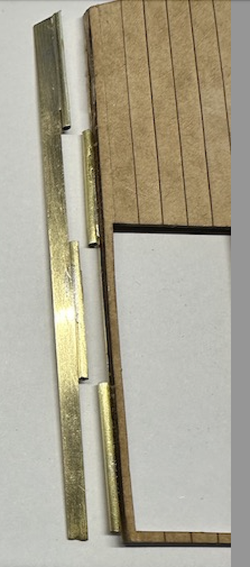 Première approche de la pose des portes : collage fin à l’Araldite de tubes laitons, en alternance sur les portes et sur les poteaux de la remise :