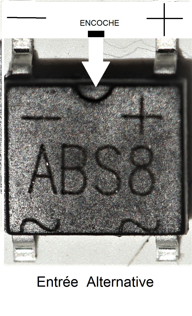 ou le contraire selon la façon dont on le tient mais c'est gravé et en plus, il y a une petite encoche en demi-cercle entre le + et le - que l'on voit au-dessus du nom du pont "ABS8. Cette encoche est au-dessus d'"ABS8".