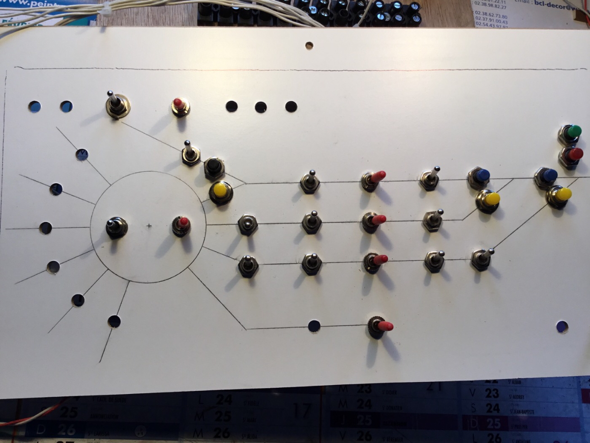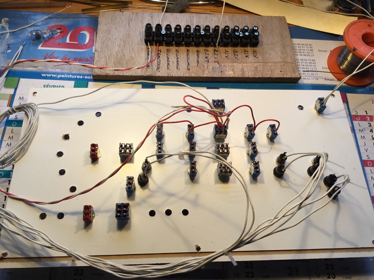 Aujourd'hui quelques avancées sur le dépôt côté technique. J'attaque la cablage du petit pupitre qui permettra de manœuvrer dans le dépôt. Je suis fana des pupitres rétro avec des interrupteurs dans tous les sens. C'est complètement has been à l'heure du numérique, mais c'est mon côté "vieux"...