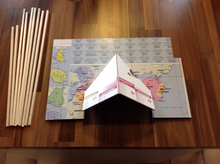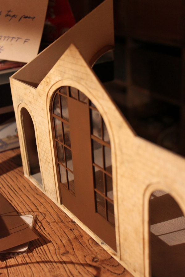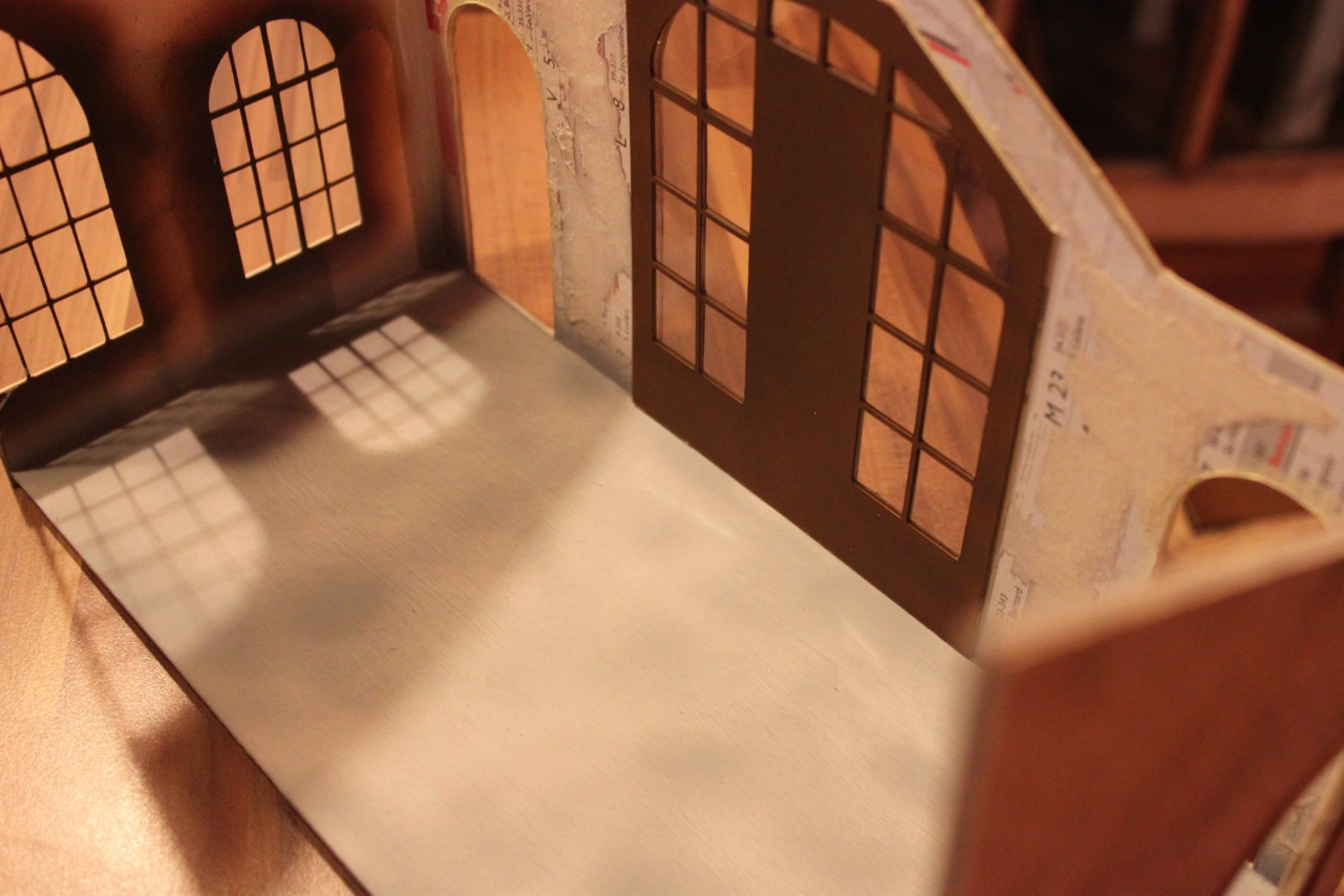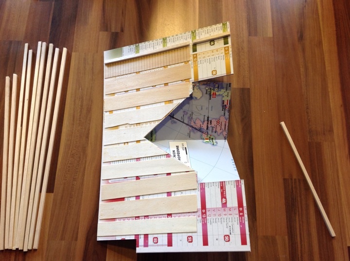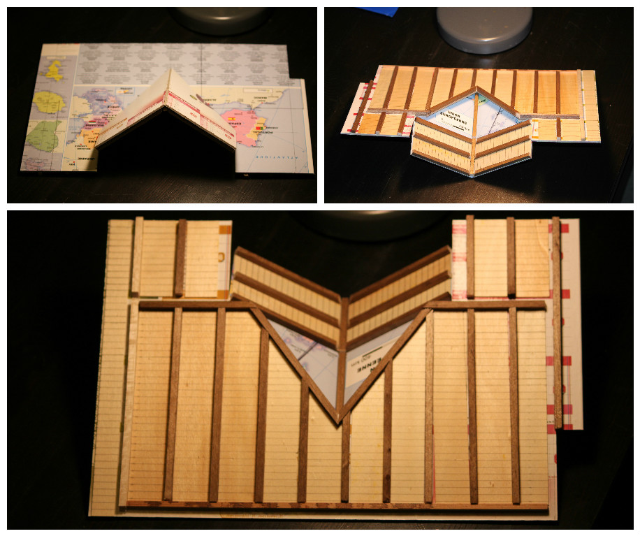 Pendant que l'aménagement interieur se poursuit, j'attaque la toiture. L''ossature est faite en calendrier, les poutres de la charpente en balsa et le lambris de la toiture sera évoqué avec...de la boite de camembert!