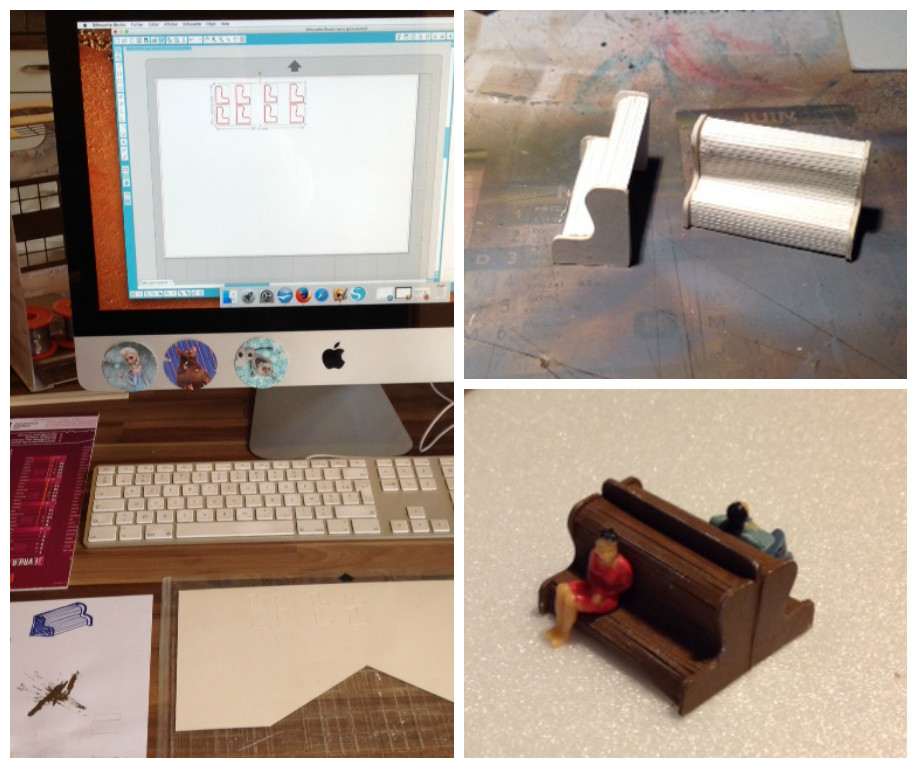 Et pour finir, un petit zoom sur le banc double, partant d'un croquis de monsieur, un coup de plan sur la Cameo, une petite découpe.