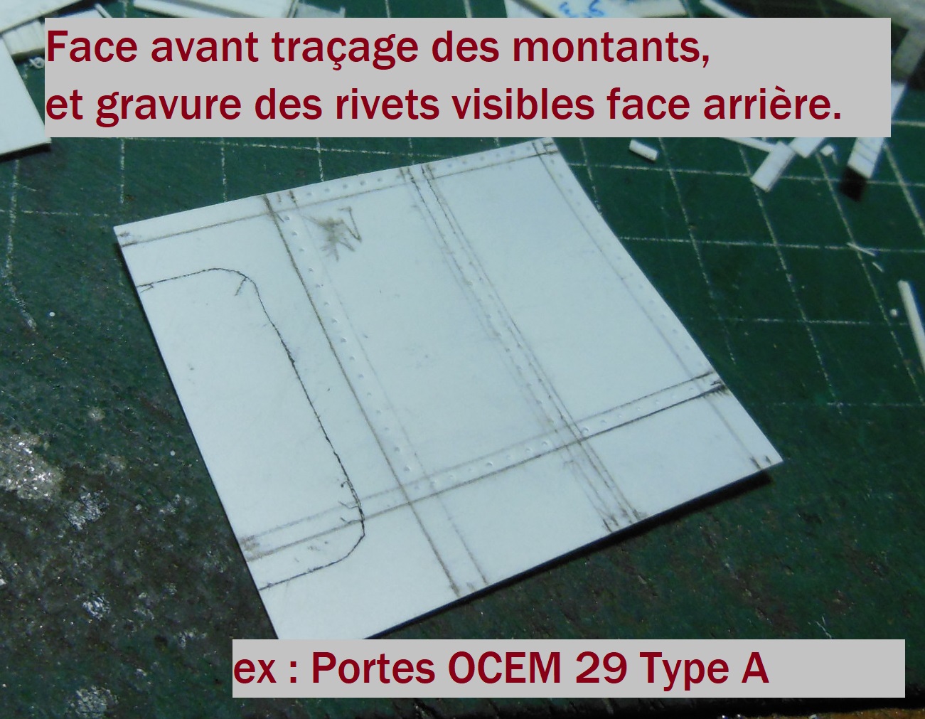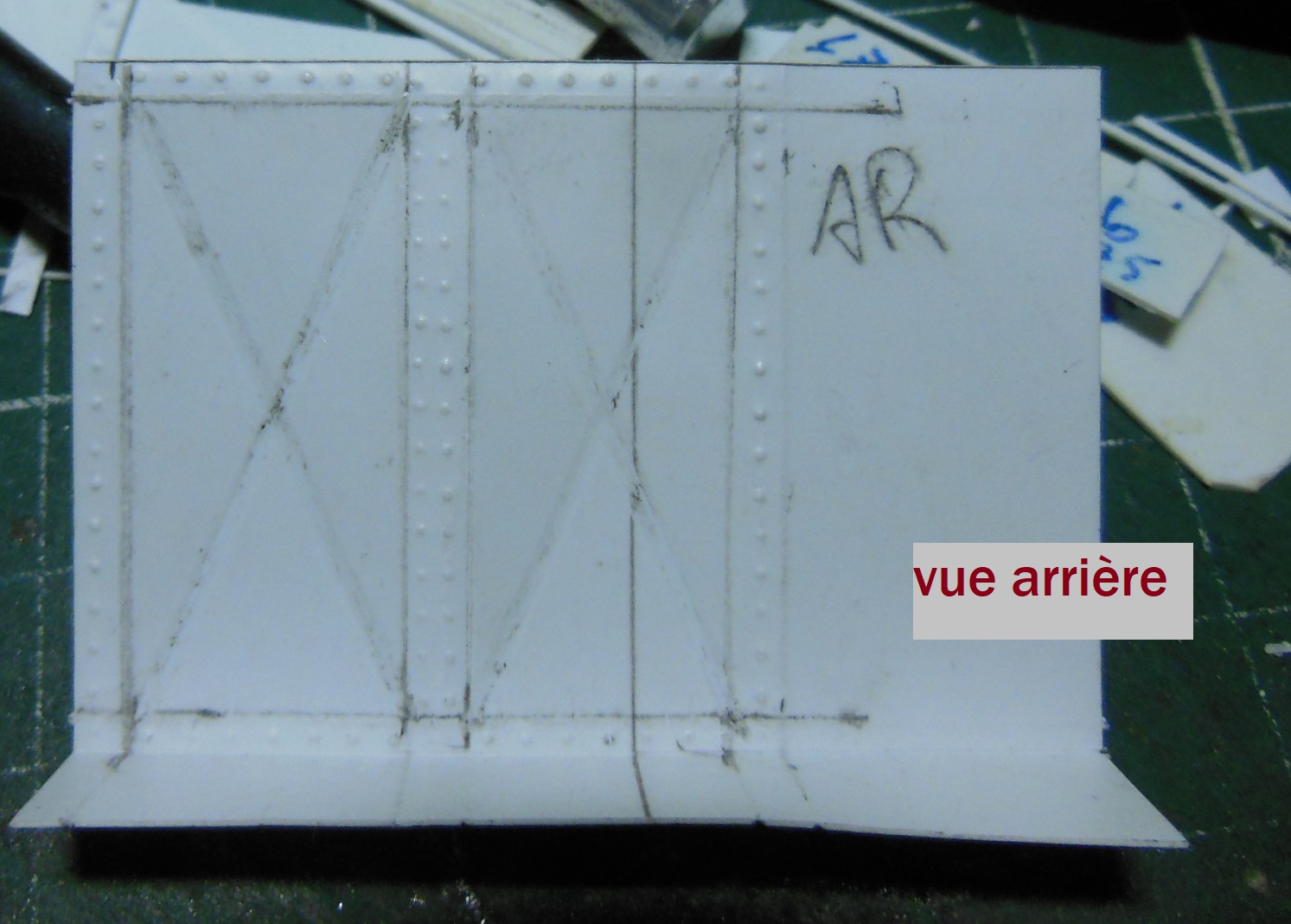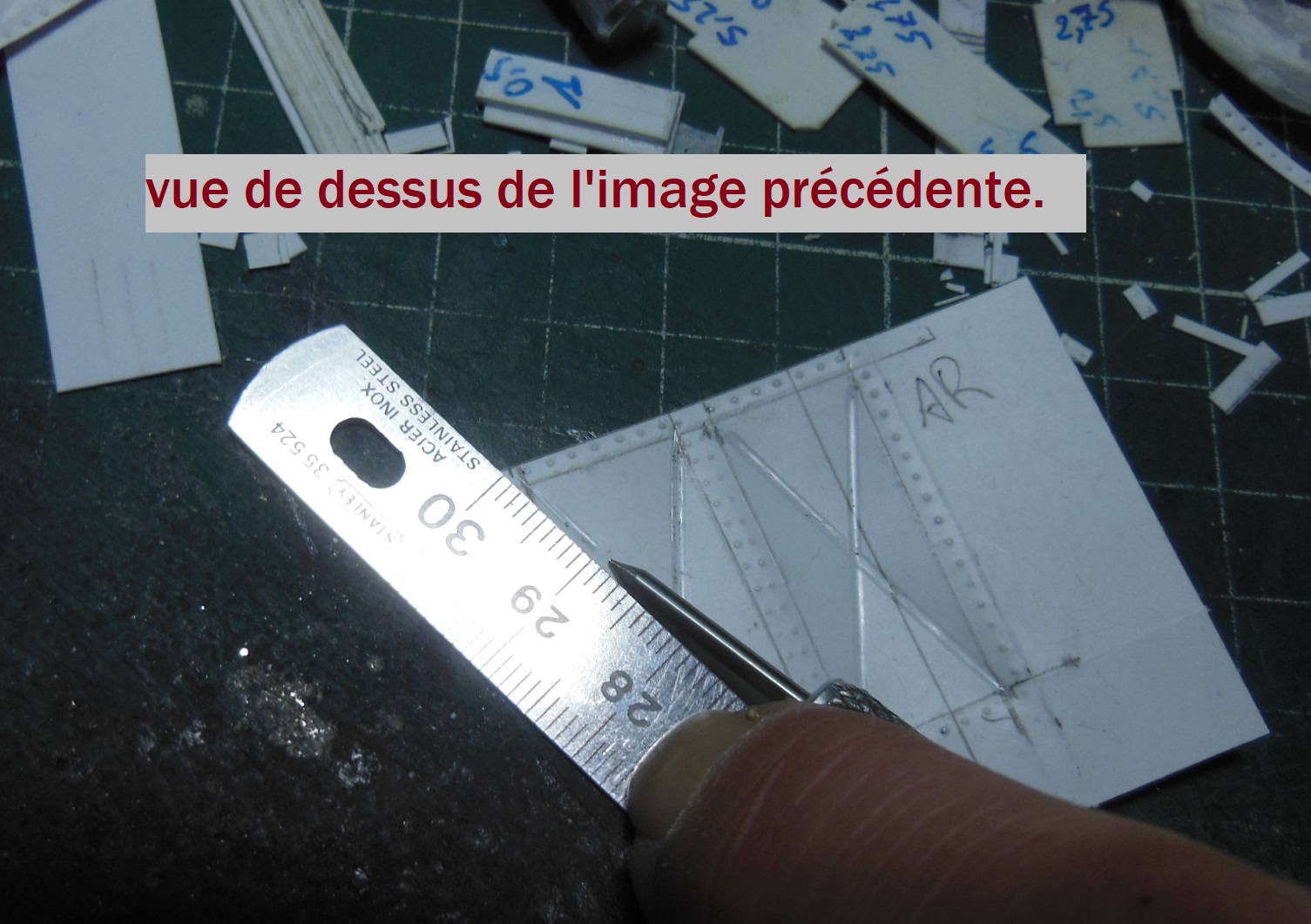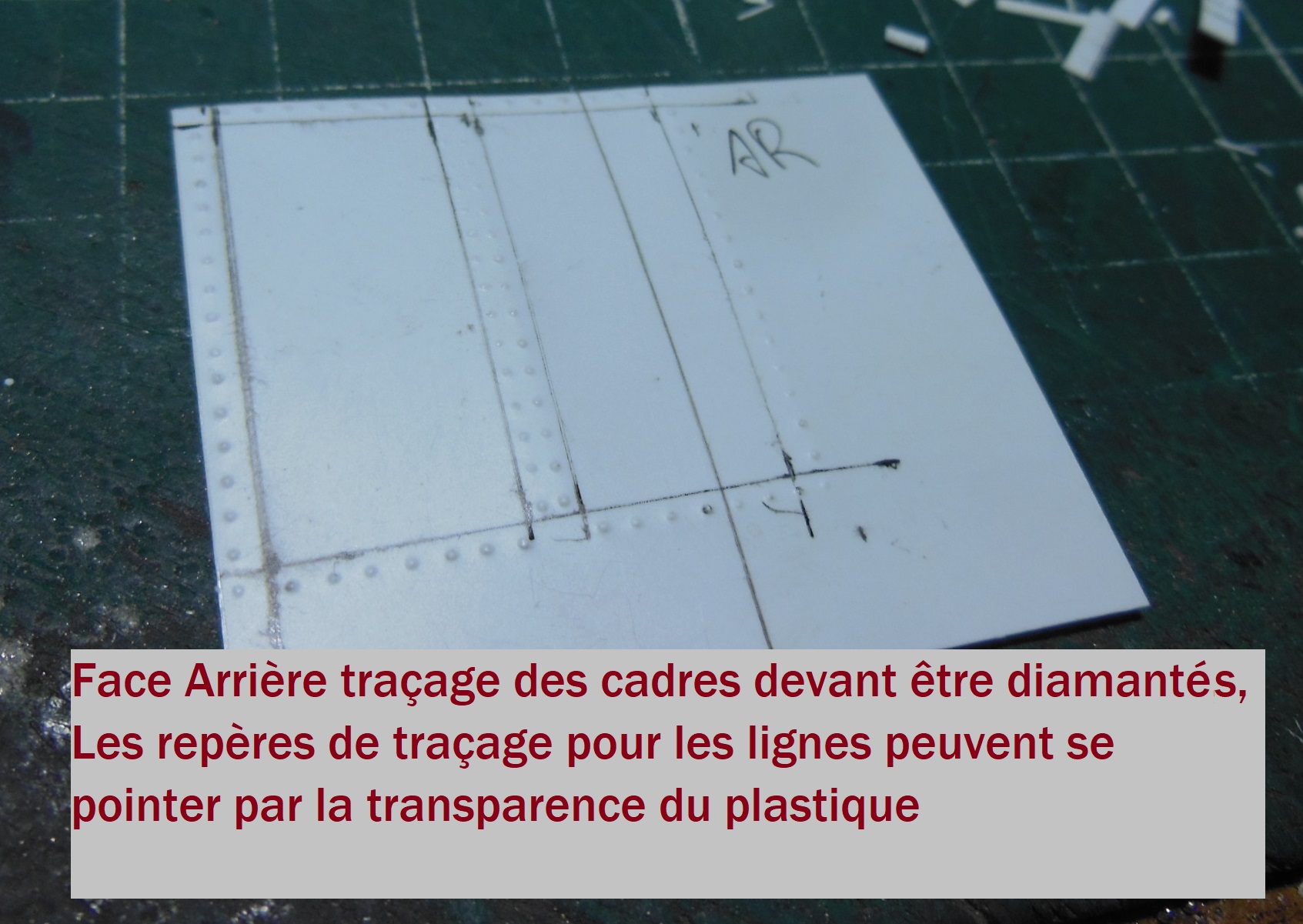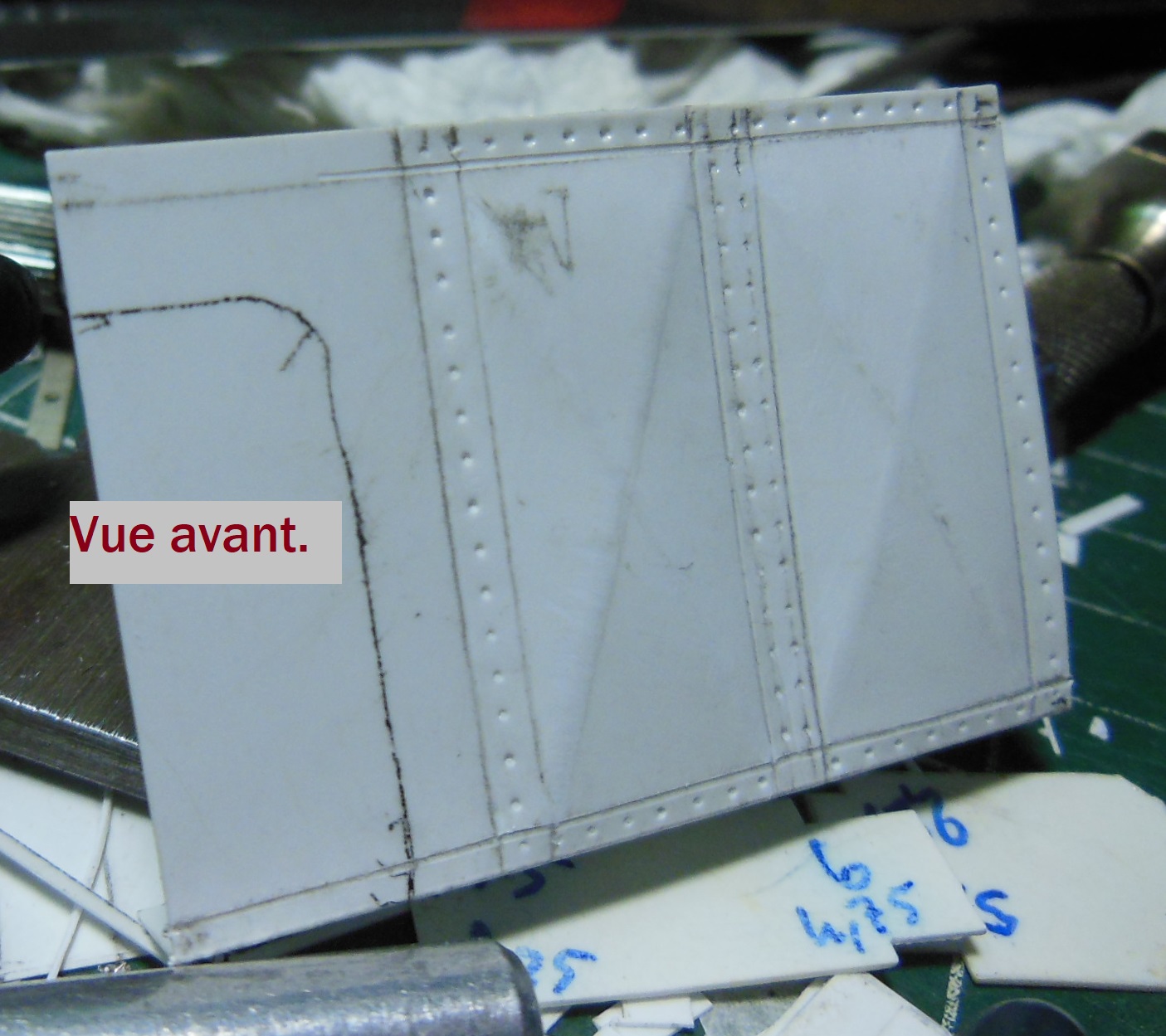 Avec une queue d'ex foret de 0.3mm en guise de pointe à tracer, et repoussoir à rivets, je marque les bordures des montants sur la face avant,